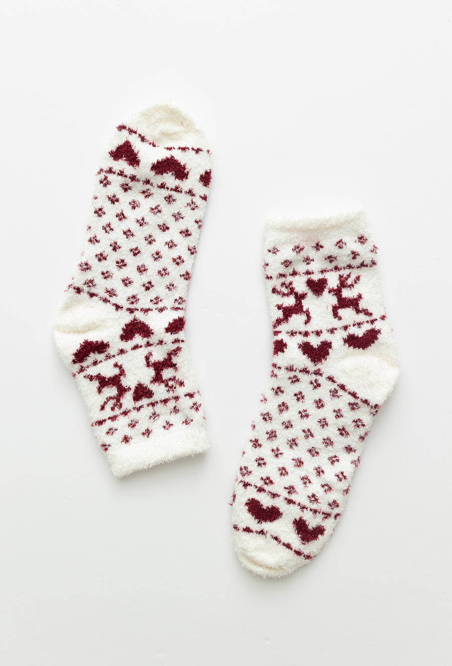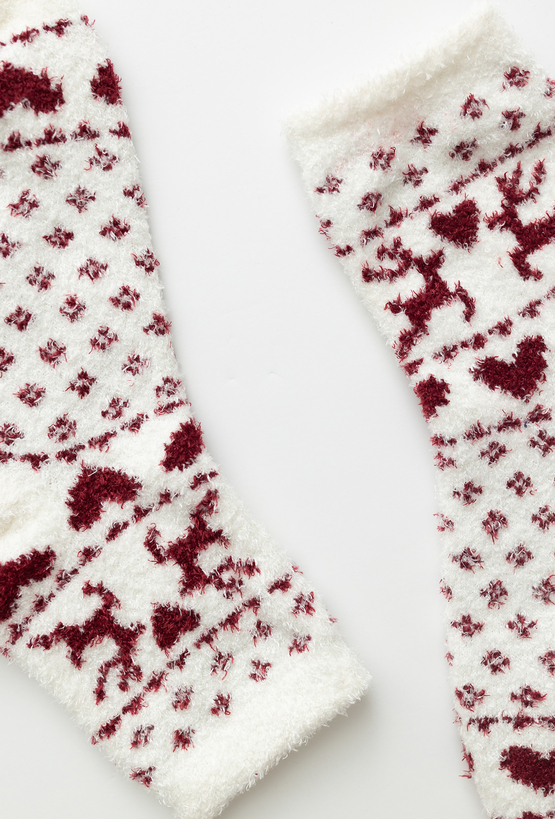 Skarpety dziecięce świąteczne chenille w kolorze ecru to miękki i ciepły dodatek idealny na zimę. Wykonane z przyjemnego w dotyku materiału z dodatkiem elastanu, gwarantują komfort noszenia i doskonałe dopasowanie. Ozdobione świątecznym motywem reniferów i serduszek, wprowadzają magiczny klimat zimowych dni. Idealne do noszenia w domu, do przedszkola czy jako uroczy prezent.