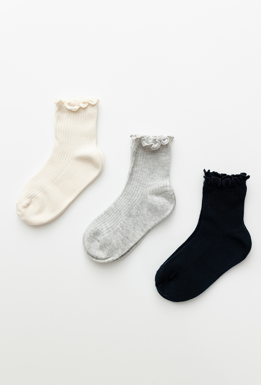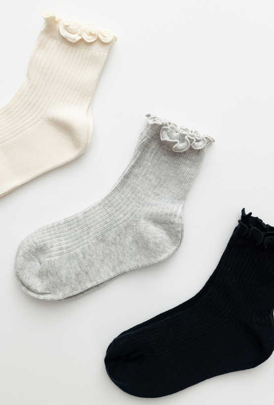 Zestaw 3 par dziewczęcych skarpet z dekoracyjnym wykończeniem u góry. Wykonane z miękkiej bawełny (80%) z dodatkiem poliamidu i elastanu, zapewniają komfort noszenia i trwałość. Idealne do eleganckich i codziennych stylizacji.