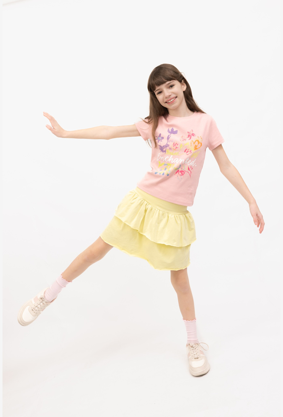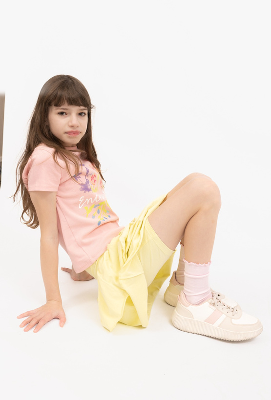 Dziewczęce spódnico-spodnie w kolorze żółtym z dwiema falbankami to świetne połączenie wygody i dziewczęcego stylu. Wyglądają jak spódniczka, a dzięki krojowi spódnico-spodni zapewniają swobodę ruchu podczas zabawy i spacerów. Model został uszyty z elastycznej dzianiny (95% bawełna, 5% elastan), która jest miękka, przyjemna dla skóry i dobrze dopasowuje się do sylwetki. Idealne do t-shirtów, bluz i lekkich kurtek — na wiosnę i lato.