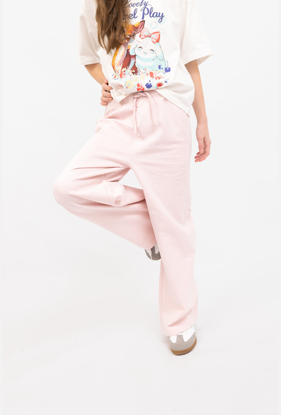Dziewczęce spodnie dresowe w kolorze różowym o kroju wide leg to wygodna baza do codziennych stylizacji. Model ma kieszenie boczne oraz ozdobny sznurek w pasie, który dodaje sportowego charakteru. Uszyte z 100% bawełny, są miękkie i przyjemne w noszeniu. Świetnie sprawdzą się do t-shirtu, bluzy i sneakersów – do szkoły, na spacer i na luz.