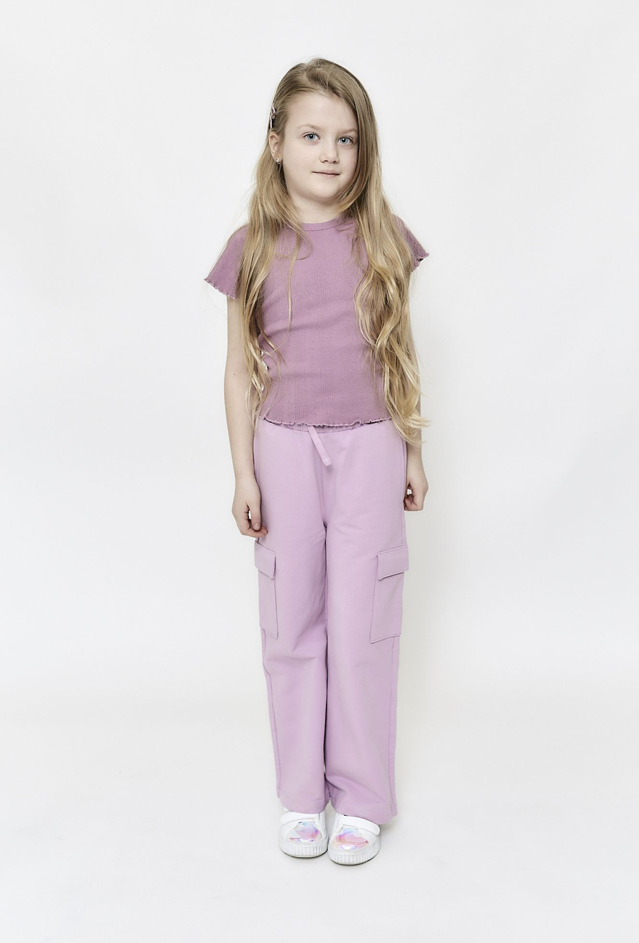 Dziewczęce spodnie o fasonie wide leg w subtelnym, liliowym kolorze. Luźne nogawki zapewniają komfort oraz swobodę ruchów podczas aktywności. Charakterystyczne, pojemne kieszenie cargo umieszczone po bokach dodają spodniom praktycznego charakteru. Elastyczny pas ze sznurkiem umożliwia wygodne dopasowanie do sylwetki. Idealnie komponują się zarówno z bluzkami, jak i sportowymi elementami garderoby, tworząc wygodne zestawienia na co dzień.