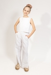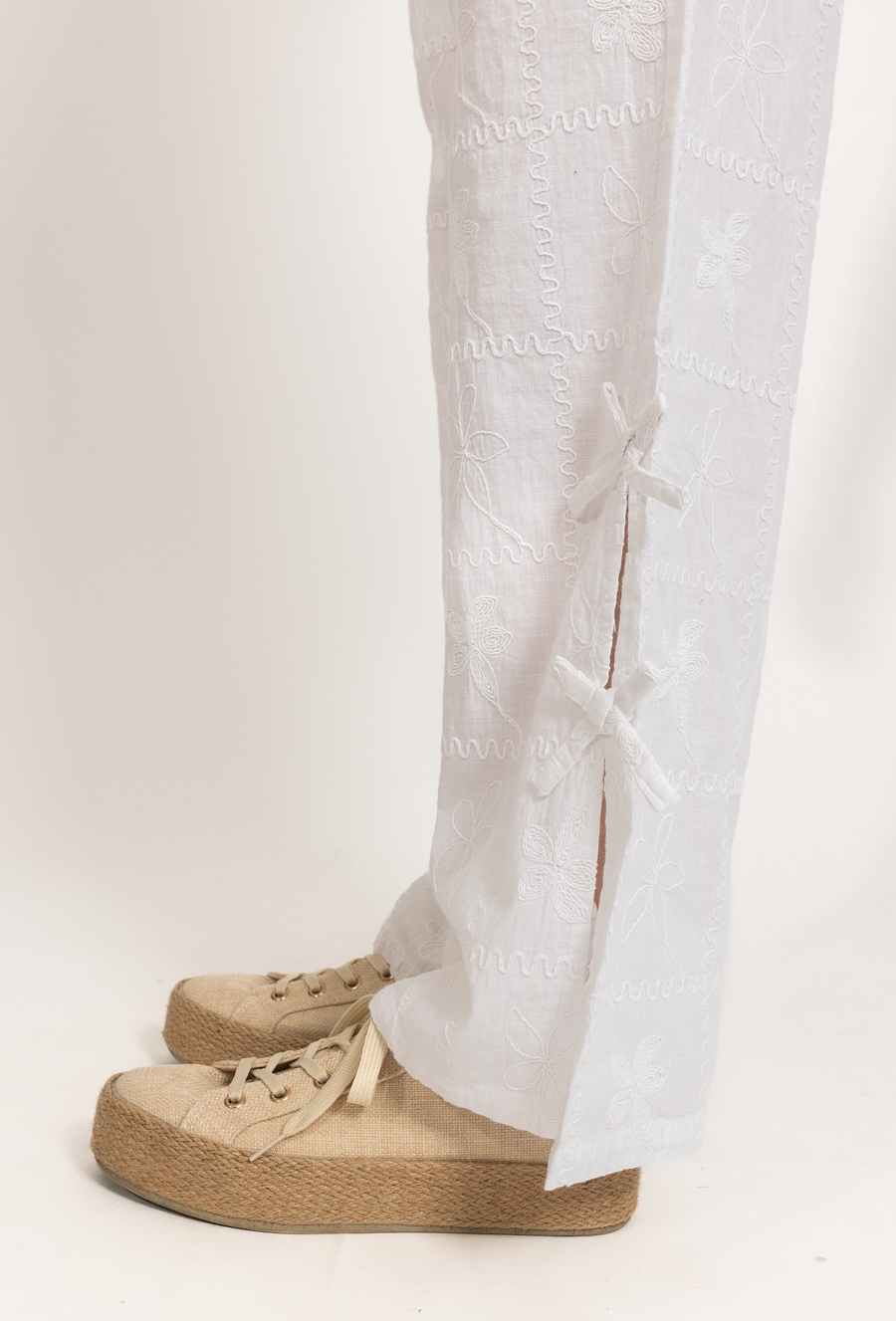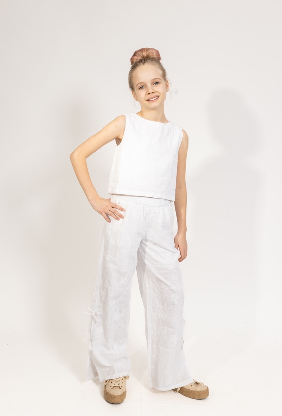 Wprowadź nutę wyrafinowanego stylu do garderoby swojej córki dzięki tym wyjątkowym spodniom. Model łączy w sobie najmodniejszy fason Wide Leg (szerokie nogawki) z delikatnością i dziewczęcym urokiem, stanowiąc idealny wybór na uroczyste okazje. Całą powierzchnię ubrania zdobi subtelny, misternie wyszywany wzór w kwiaty oraz geometryczne fale, co nadaje spodniom unikalnego charakteru.Po bokach nogawek, przy dolnych krawędziach, umieszczono urocze, pionowe rozcięcia, które są zwieńczone dwiema ozdobnymi kokardkami, dodając stylizacji lekkości. Te spodnie stworzą zachwycający komplet z pasującą bluzką z tej samej linii wzorniczej, tworząc stylizację idealną na chrzest, wesele, akademie czy święta.