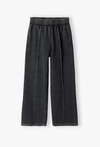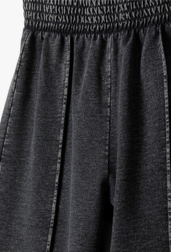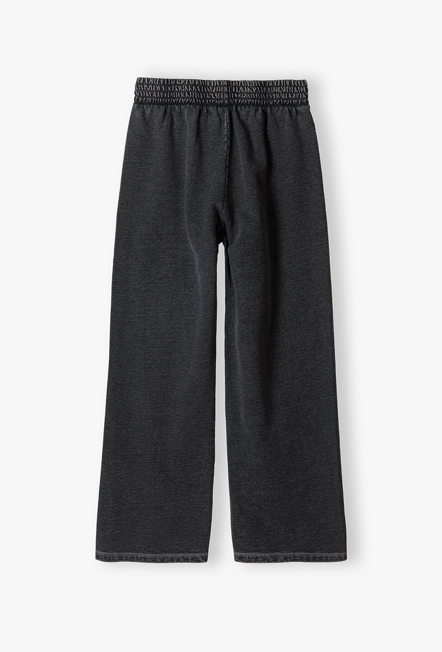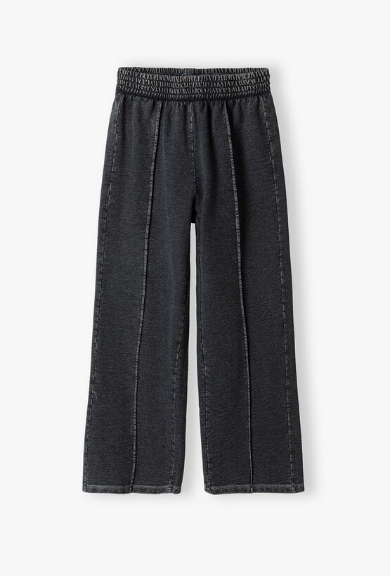 Połącz wygodę klasycznych dresów z najgorętszym trendem sezonu! Te ciemnoszare spodnie o fasonie Wide Leg (szeroka nogawka) to idealna propozycja dla dziewcząt, które śledzą trendy i cenią sobie swobodę. Efekt delikatnego sprania oraz unikalne detale sprawiają, że spodnie te wyróżniają się na tle klasycznych modeli. Szeroka, prosta nogawka to absolutny „must-have” w szafie każdej nastolatki. Krój ten nie tylko zapewnia maksymalną wygodę, ale też świetnie modeluje sylwetkę i nadaje stylizacji miejskiego luzu. Szeroka, elastyczna guma z gęstym marszczeniem zapewnia idealne dopasowanie do talii, nie powodując ucisku. Dzięki niej spodnie zawsze pozostają na swoim miejscu, niezależnie od aktywności. Ciemnoszary odcień z delikatnymi przetarciami nadaje spodniom modny wygląd vintage, który doskonale komponuje się z białym T-shirtem w paski lub neonowymi dodatkami.