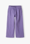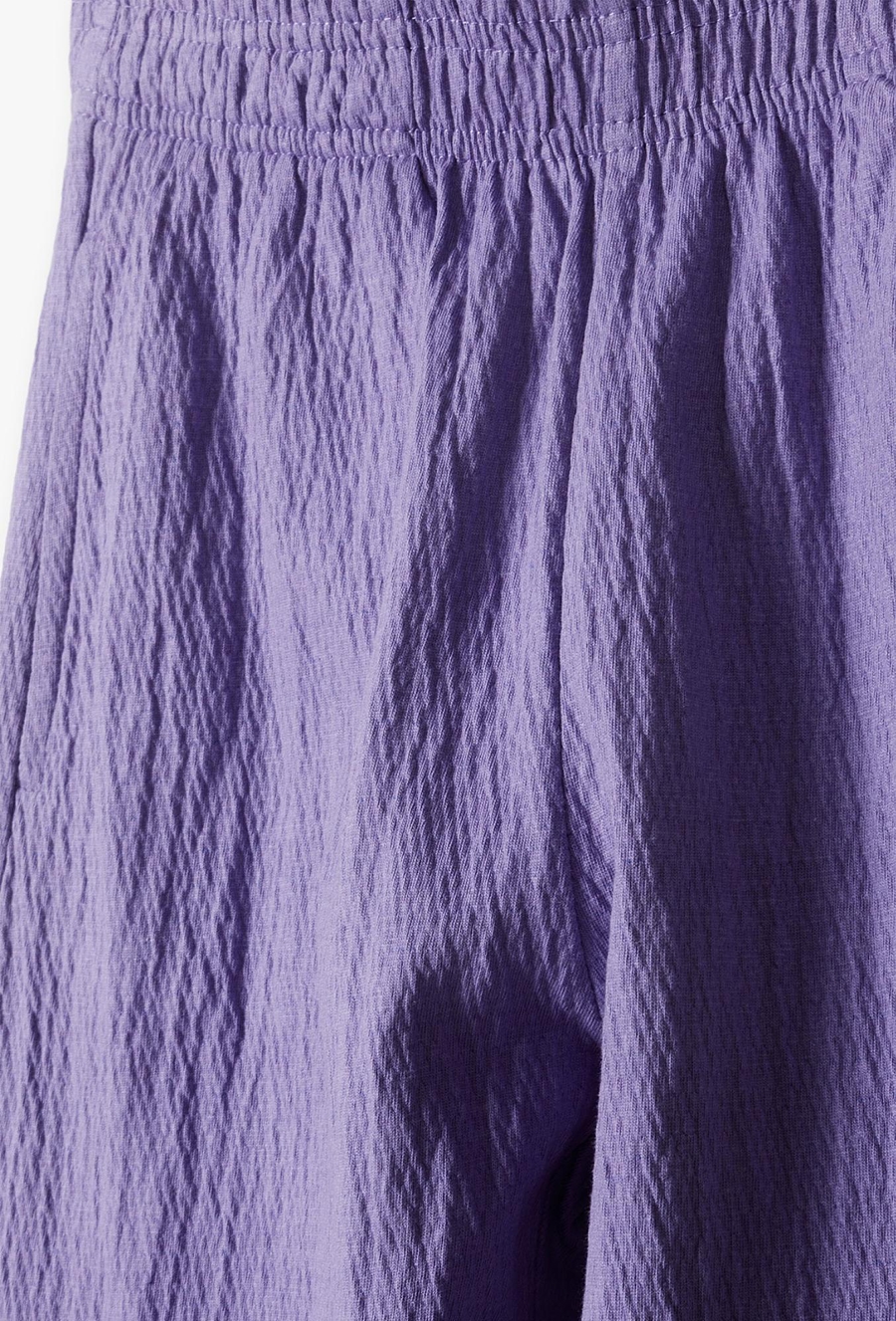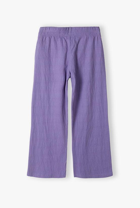 Postaw na najmodniejszy fason sezonu! Te fioletowe spodnie o kroju Wide Leg to idealne połączenie nowoczesnego designu z maksymalnym komfortem. Dzięki niezwykle lekkiej, strukturalnej tkaninie i szerokim nogawkom, spodnie te zapewniają doskonałą przewiewność, stając się niezastąpionym elementem letniej garderoby każdej stylowej dziewczynki. Bardzo szerokie, proste nogawki to absolutny trend, który dominuje w modzie młodzieżowej. Fason ten nie tylko świetnie wygląda, ale gwarantuje też pełną swobodę ruchów i komfort nawet w najbardziej upalne dni. Intensywny, liliowy odcień fioletu doskonale współgra z letnią opalenizną i świetnie komponuje się z białymi T-shirtami, neonowymi dodatkami czy pastelowymi skarpetkami z haftem serca.