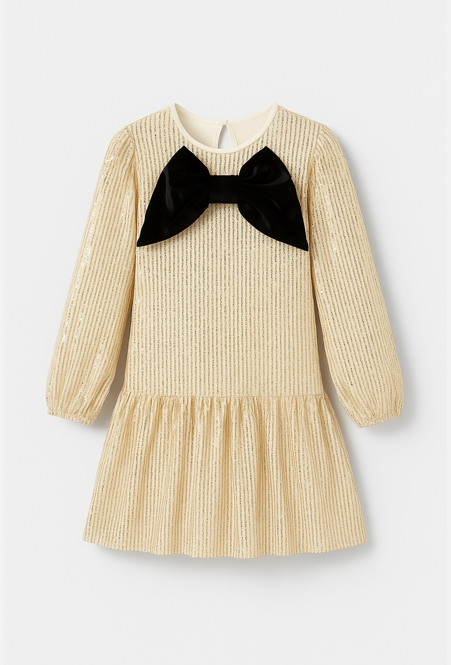 Stylowa i efektowna sukienka z długim rękawem, wykonana z miękkiej, błyszczącej dzianiny o delikatnej strukturze. Złote nitki subtelnie połyskują w świetle, a duża czarna kokarda z przodu dodaje całości elegancji. Sukienka ma wygodny krój, lekko rozkloszowany dół i zapięcie na guzik z tyłu. To doskonały wybór na święta, przyjęcia, bale lub inne wyjątkowe okazje. Połączenie klasy, blasku i dziewczęcego uroku w jednej stylizacji.