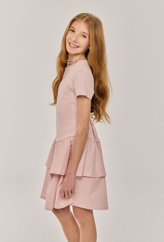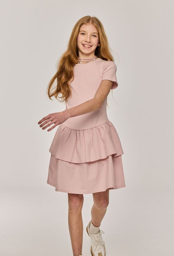Różowa sukienka dziewczęca z krótkim rękawem. Góra z elastycznej dzianiny zapewnia wygodę, a warstwowa część spódnicy nadaje lekkości i ładnie układa się w ruchu. Sukienka ma krótki rękaw i sprawdzi się zarówno na co dzień, jak i na rodzinne wyjścia – wystarczy dobrać trampki, baleriny albo sandałki.