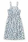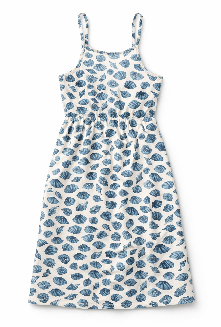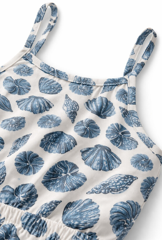 Ta sukienka to idealna propozycja na upalne, letnie dni, łącząca wygodę z modnym, wakacyjnym stylem. Wykonana z lekkiej i przewiewnej dzianiny, zapewnia pełną swobodę ruchów podczas zabawy na plaży, spacerów czy wakacyjnych wyjazdów. Model wyróżnia się uroczym, niebieskim nadrukiem w muszelki, równomiernie rozmieszczonym na jasnym tle w kolorze ecru. Sukienka posiada cienkie, komfortowe ramiączka oraz marszczenie w pasie, które nadaje jej dziewczęcego kształtu i sprawia, że dół sukienki pięknie układa się w ruchu. Swobodny, rozkloszowany krój gwarantuje komfort noszenia przez cały dzień.
