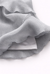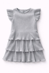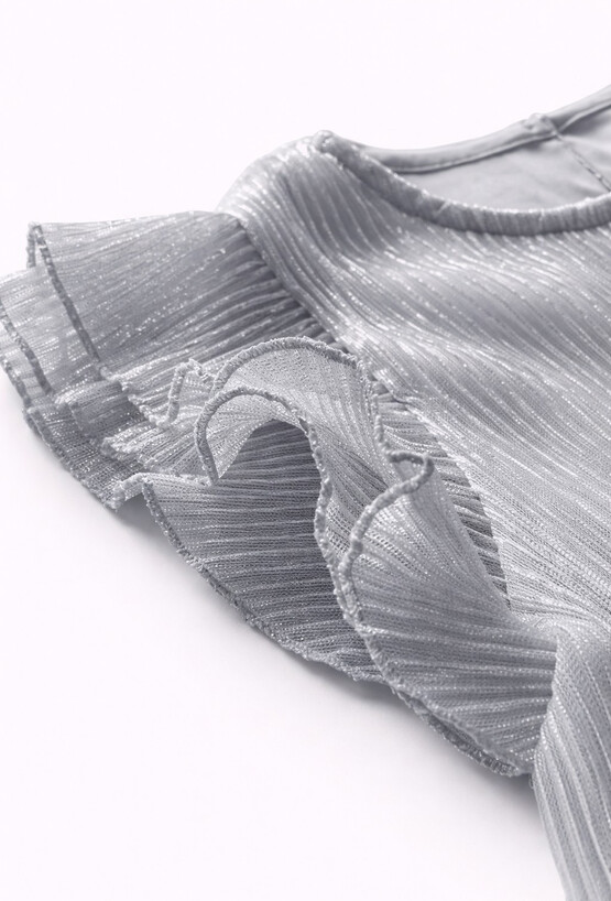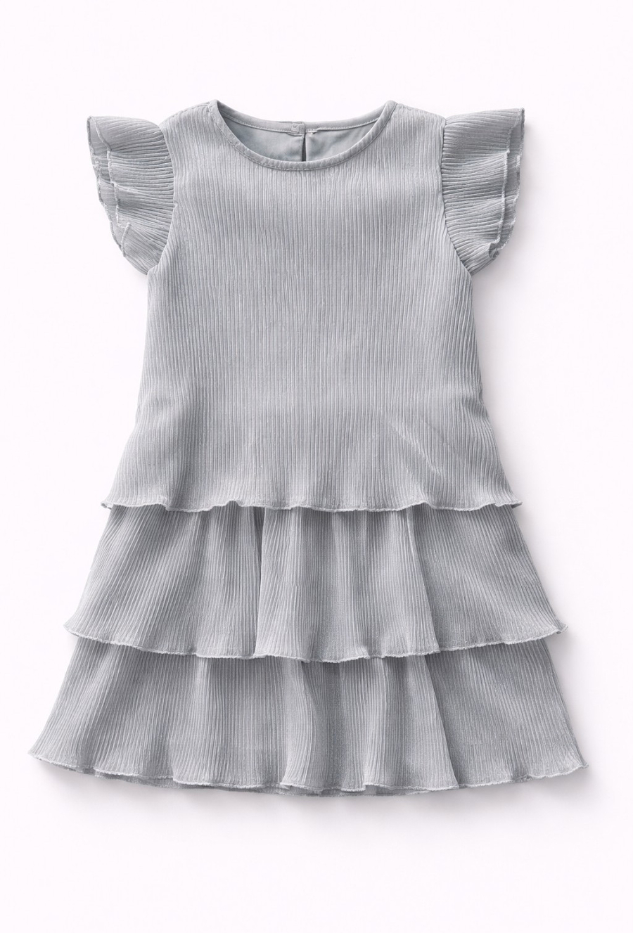 Sukienka z krótkim rękawem to świetny wybór na wyjątkowe okazje. Ma delikatnie błyszczące wykończenie i pięknie układające się warstwy falbanek, które dodają lekkości i elegancji. Krótkie rękawki w formie falbanek podkreślają dziewczęcy charakter, a wygodny fason sprawia, że sukienka sprawdzi się zarówno na rodzinne uroczystości, jak i na przyjęcia czy szkolne występy.