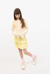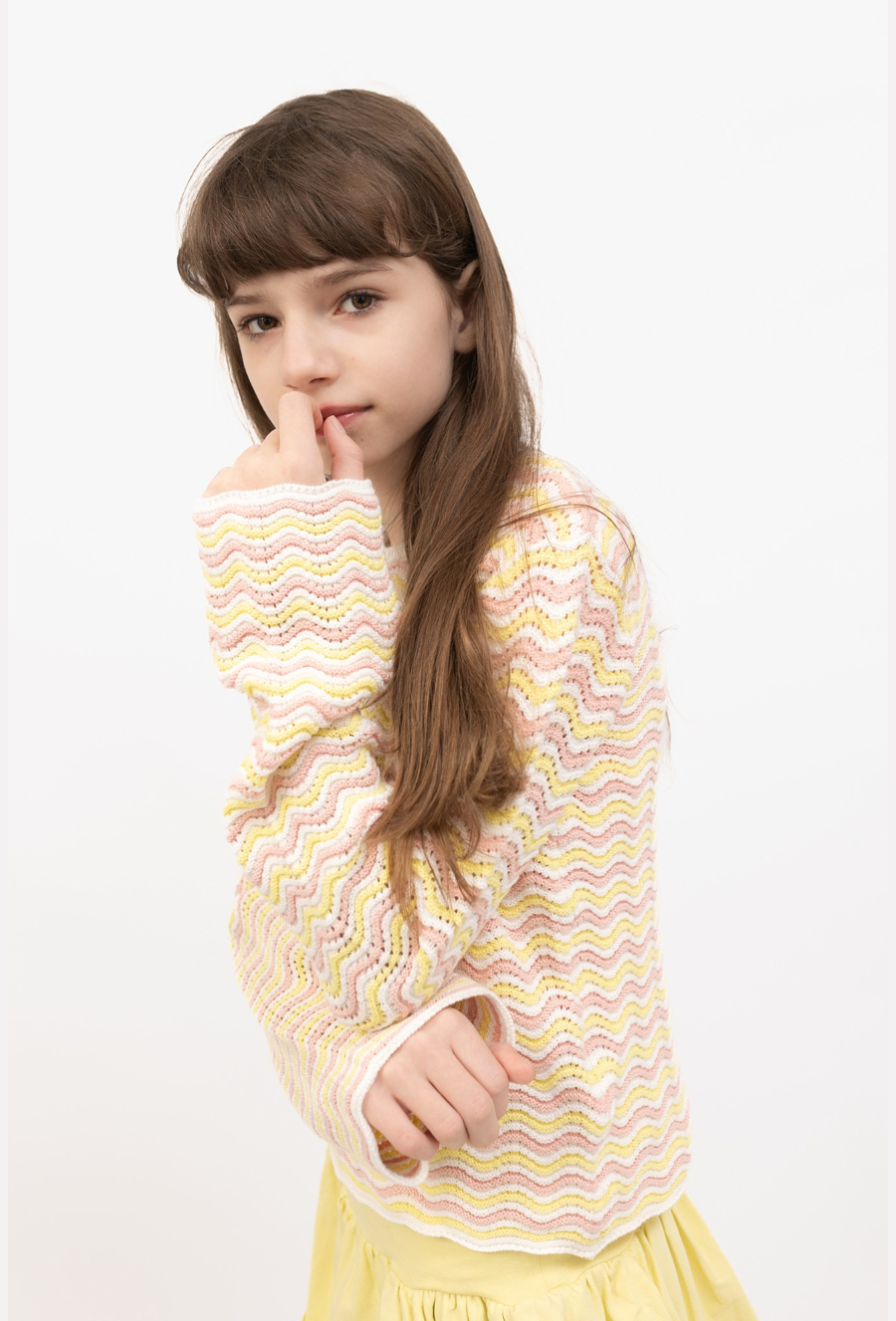 Ten różowy sweter dziewczęcy to świetny wybór na dni, kiedy przyda się lekka warstwa. Model jest nierozpinany i wykonany z 100% bawełny, dzięki czemu jest przewiewny, miękki i komfortowy w noszeniu. Sweter wyróżnia się dzianiną w ażurowe pasy w pogodnych kolorach: białym, różowym i żółtym. Delikatne prześwity dodają mu lekkości, a klasyczny krój sprawia, że pasuje zarówno do spódniczek, jak i spodni. Ściągacze przy dekolcie, mankietach i na dole pomagają utrzymać fason i zapewniają wygodne dopasowanie.