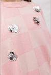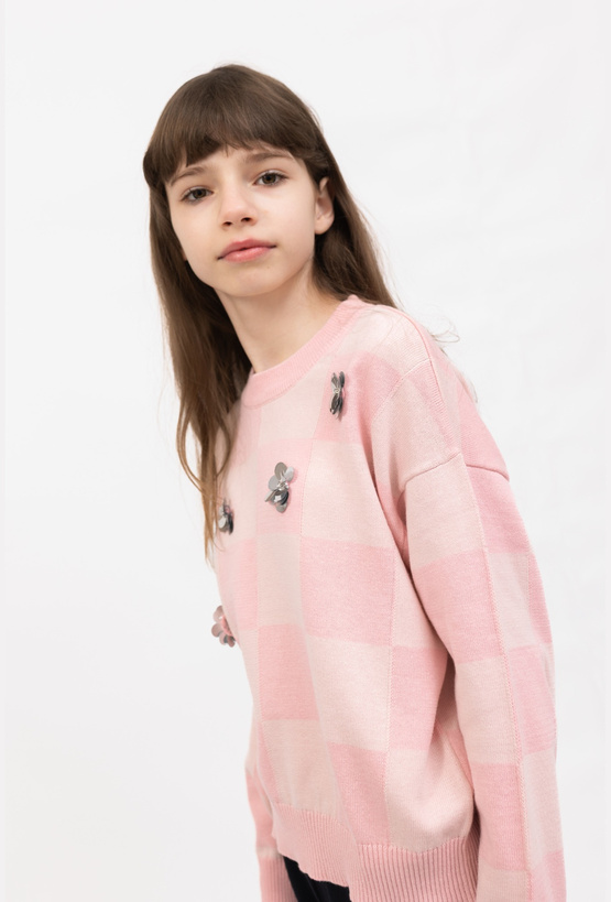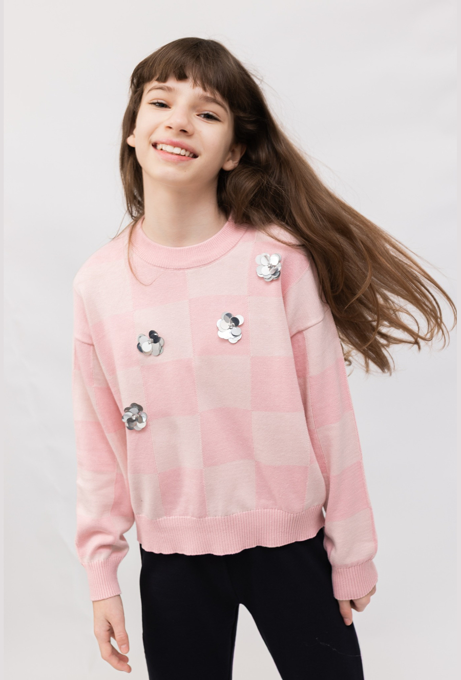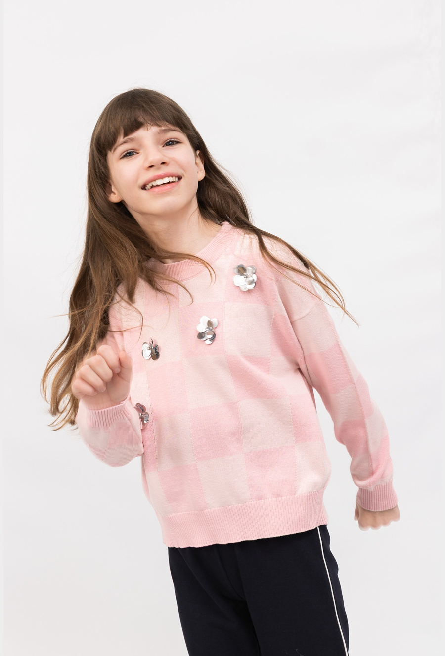 Sweter dziewczęcy w szachownicę z cekinowymi aplikacjami