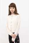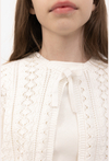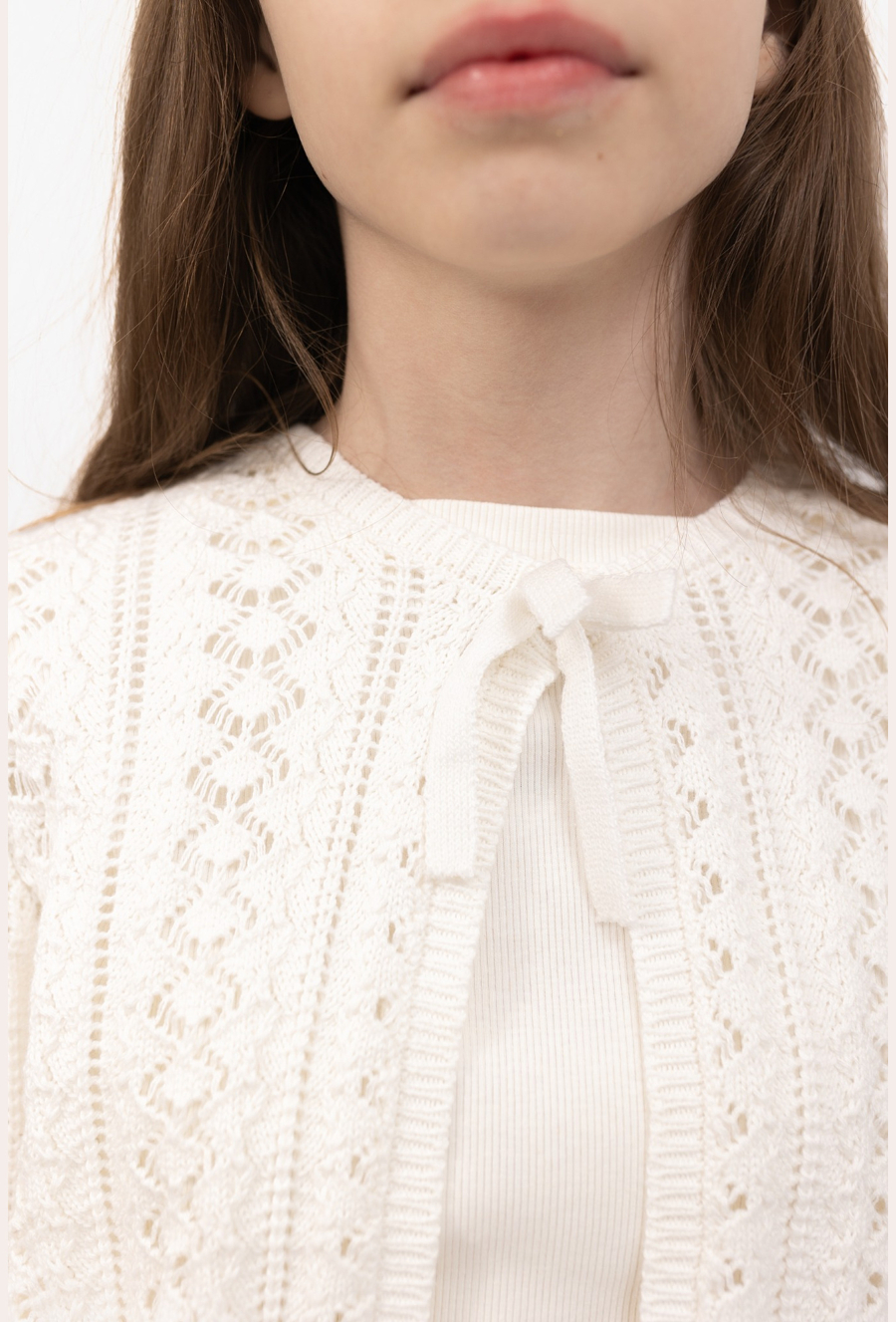 Elegancki, a jednocześnie lekki biały sweter dziewczęcy rozpinany to idealne uzupełnienie stylizacji na każdą porę roku. Wykonany z 100% bawełny, jest miękki, przewiewny i przyjemny dla skóry – świetnie sprawdzi się zarówno w szkole, jak i podczas rodzinnych uroczystości. Sweter ma piękny dziany ażurowy wzór, który nadaje mu delikatności i subtelnego charakteru. Zamiast klasycznych guzików zastosowano praktyczne zapięcie pod szyją na zatrzask – łatwe do dopięcia i estetyczne. Ściągacze przy mankietach i na dole pomagają utrzymać fason i zapewniają wygodne dopasowanie.