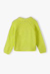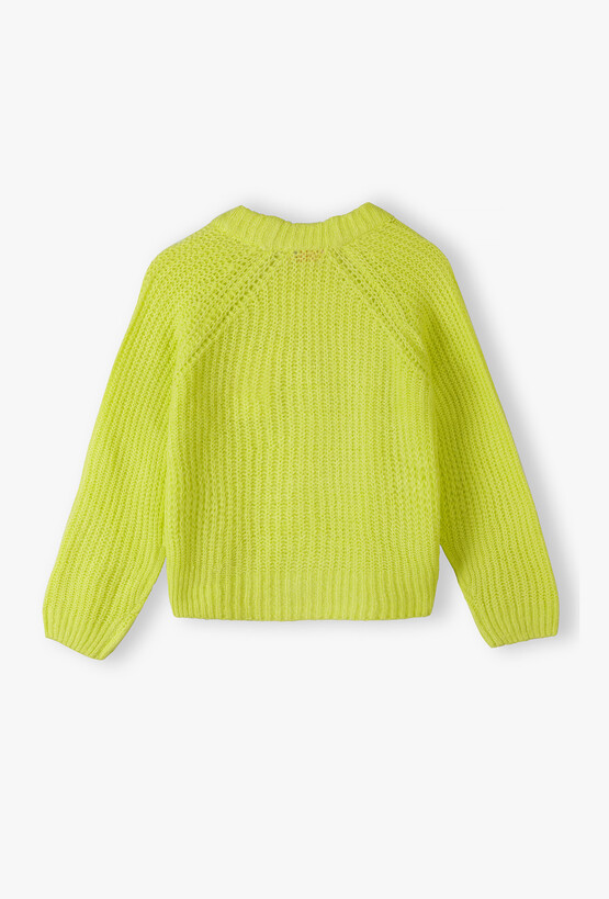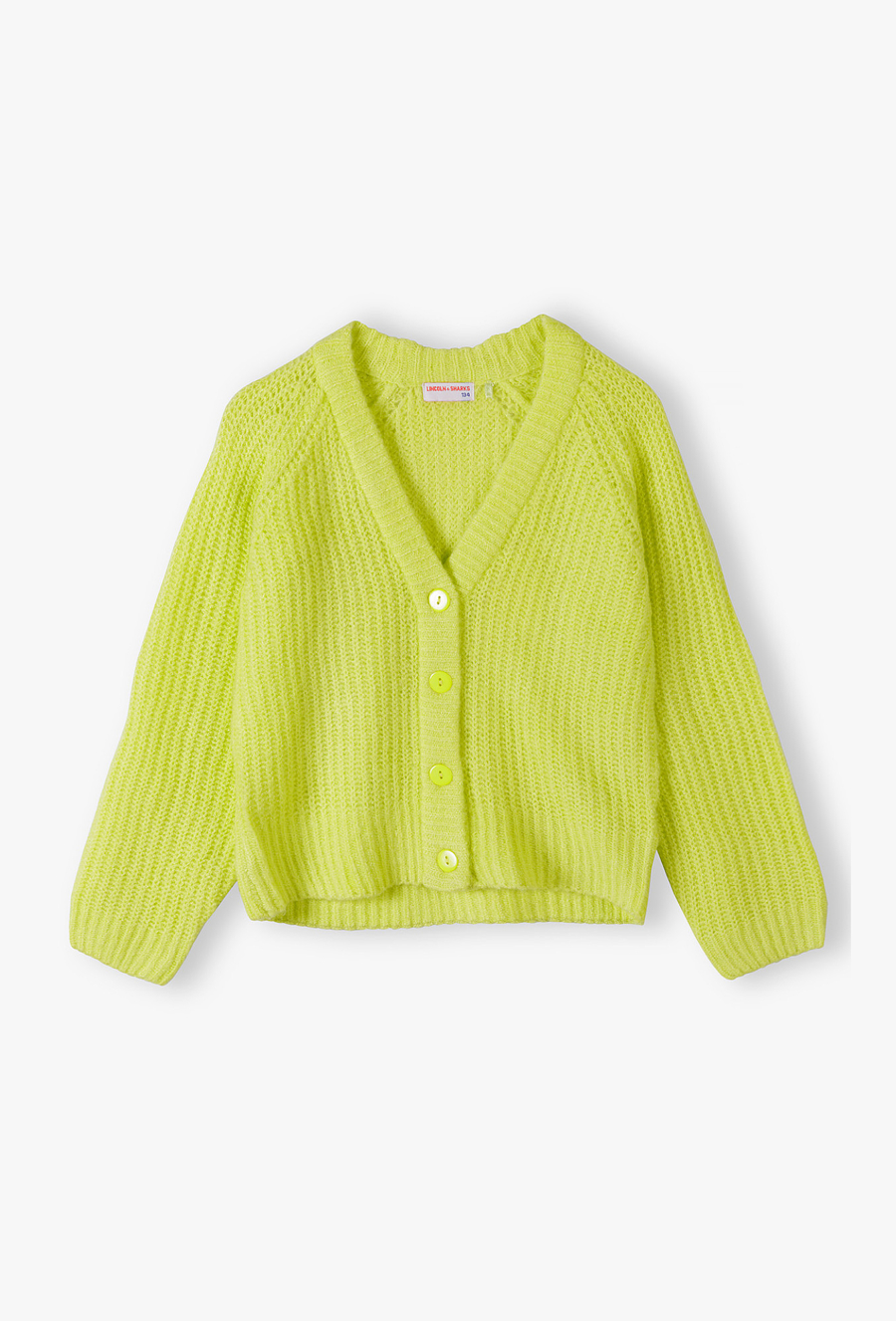 Puszysty kardigan dziewczęcy w soczystym neonowym kolorze. Rozświetl garderobę swojej córeczki tym wyjątkowym kardiganem! To idealne połączenie modnego, neonowego odcienia z niezwykłą miękkością, która zapewni dziecku ciepło i komfort w chłodniejsze dni. Kardigan posiada elegancki dekolt w kształcie litery V oraz wygodne zapięcie na cztery dopasowane kolorystycznie, błyszczące guziki. Luźniejszy krój i reglanowe rękawy gwarantują pełną swobodę podczas zabawy i codziennych aktywności.