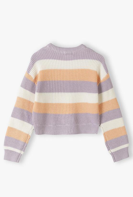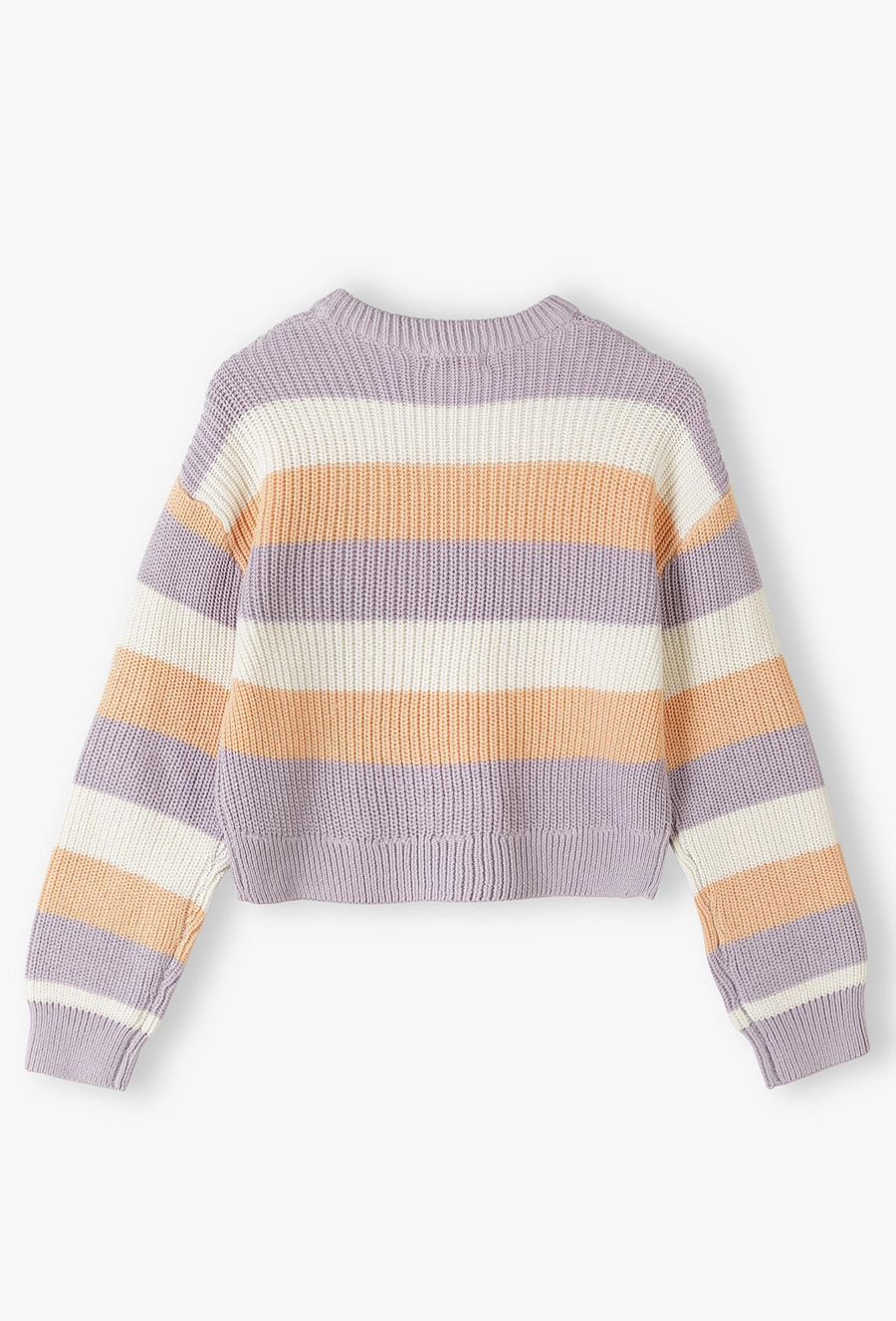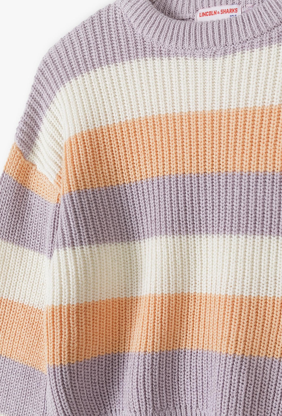 Wprowadź kolory do codziennej garderoby swojej córki! Ten wielobarwny sweter to idealne połączenie najmodniejszych trendów z wyjątkowym komfortem. Dzięki harmonijnemu zestawieniu pasów w kolorach liliowym, śmietankowym i brzoskwiniowym, sweter ten staje się wyrazistym elementem stylizacji, który pasuje zarówno do szkoły, jak i na spotkania z przyjaciółmi. Szerokie, poziome pasy w pastelowych odcieniach to klasyka, która w tym wydaniu zyskała nowoczesny, świeży charakter. To idealny wybór dla dziewcząt, które lubią wyróżniać się z tłumu. Ten pastelowy sweter to uniwersalna baza, która doda lekkości każdej stylizacji – od sportowego luzu po casualową elegancję.