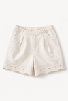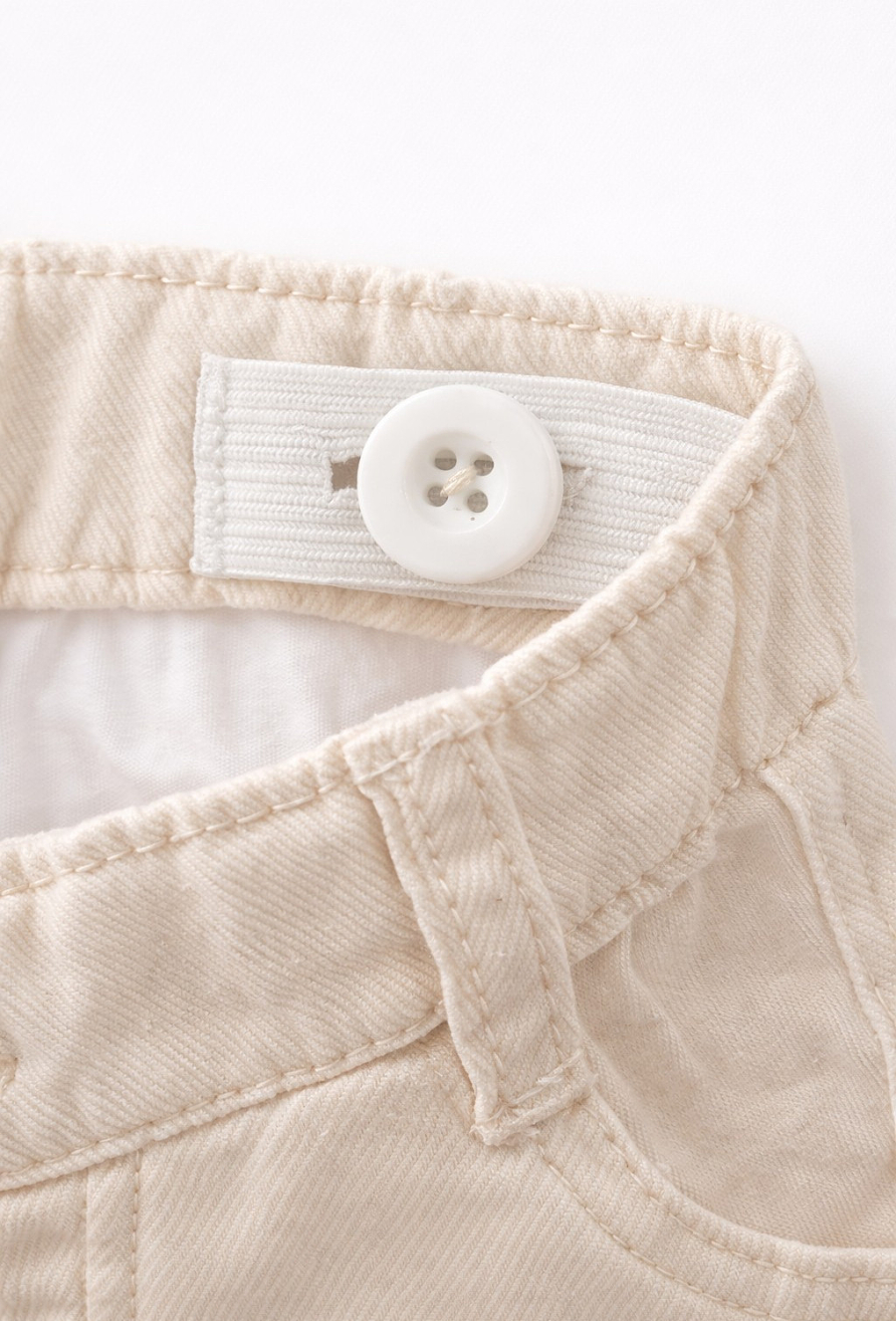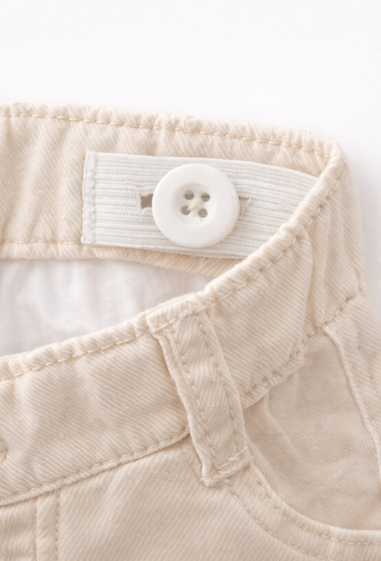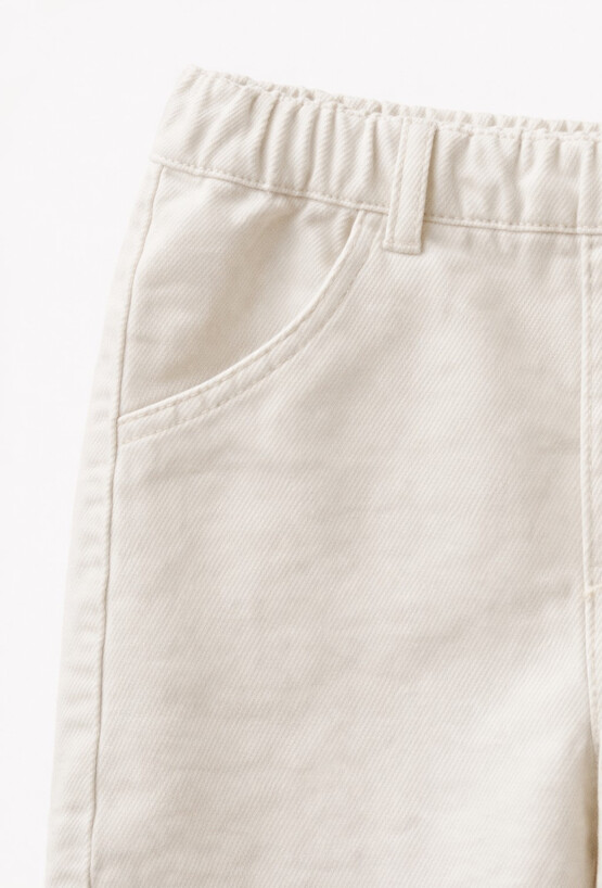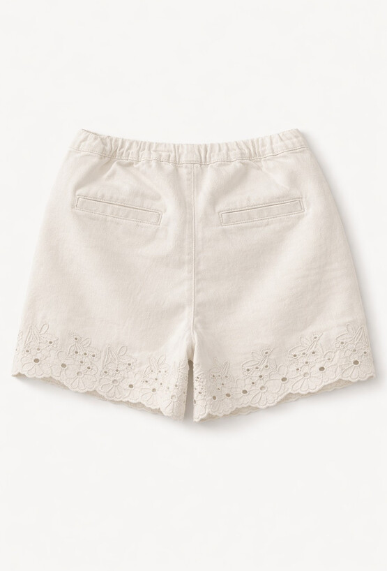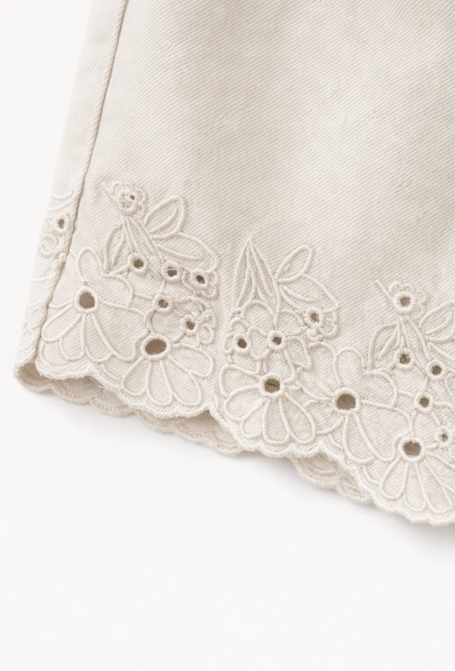 Letnia propozycja, która łączy klasyczny denimowy styl z delikatnymi, ozdobnymi detalami. Szorty wykonane z jasnego jeansu prezentują się lekko i świeżo, stanowiąc doskonałą bazę do wielu wakacyjnych stylizacji. Cechą wyróżniającą ten model jest kunsztowne, ażurowe wykończenie nogawek w formie kwiatowego haftu. Szorty zostały wyposażone w praktyczną, wewnętrzną regulację w pasie, która pozwala na idealne dopasowanie do sylwetki dziecka. Komfort noszenia zwiększa elastyczny tył pasa, a funkcjonalność zapewniają kieszenie.