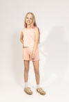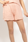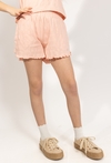 Te urocze krótkie spodenki to idealna propozycja na letnie dni, łącząca swobodę ruchów z dziewczęcym wdziękiem. Wykonane z strukturalnej dzianiny, charakteryzują się ciekawą fakturą materiału, która nadaje im nowoczesny wygląd. Dół nogawek posiada faliste wykończenie uzyskane dzięki zastosowaniu gumonici, co dodaje szortom lekkości i dziewczęcego charakteru. Szorty tworzą spójny i modny komplet z pasującą koszulką na ramiączkach z tej samej linii, ozdobioną kokardkami na plecach.
