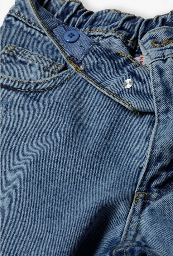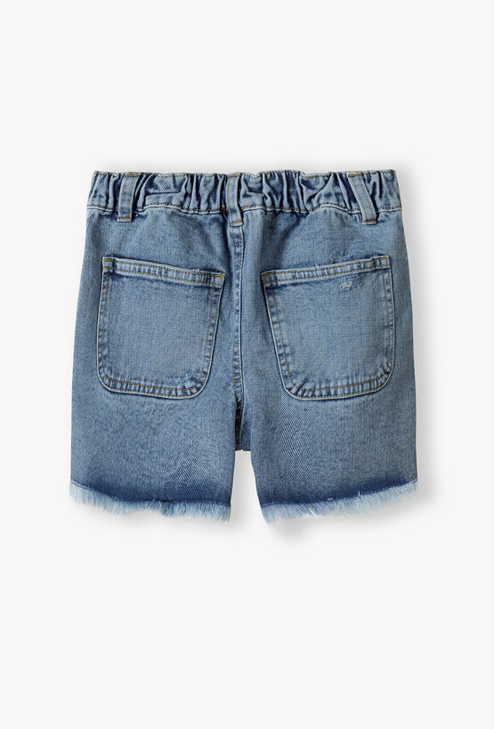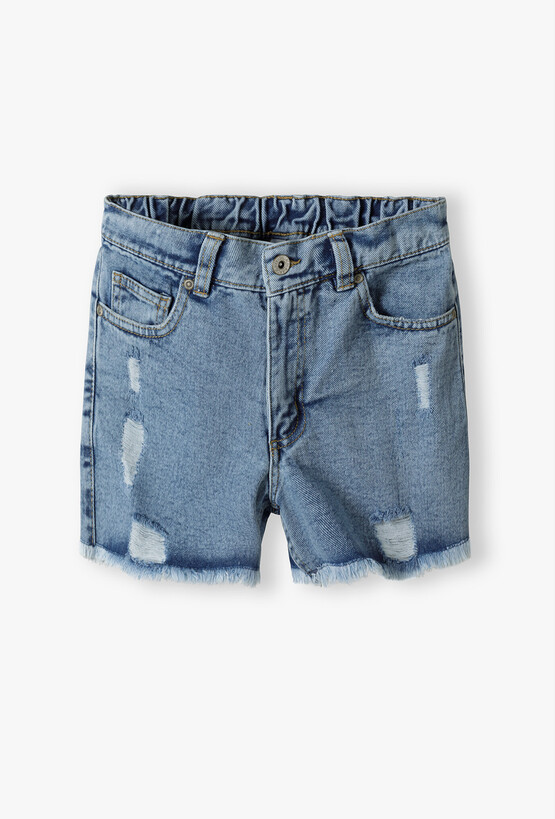 Postaw na ponadczasowy jeans w najmodniejszej odsłonie! Te krótkie spodenki to absolutny „must-have” w letniej szafie każdej dziewczyny. Łączą w sobie klasyczny denimowy styl z buntowniczymi detalami, tworząc idealną bazę do codziennych, wakacyjnych stylizacji. Spodenki charakteryzują się stylowymi przetarciami na przodzie oraz surowo wykończonymi, postrzępionymi nogawkami. Ten efekt „vintage” nadaje im luzu i charakteru. Wewnątrz paska znajduje się ukryta gumka z guzikami, która pozwala na idealne dopasowanie obwodu spodenek do sylwetki dziecka. Z tyłu pas jest dodatkowo marszczony, co gwarantuje wygodę bez ucisku.