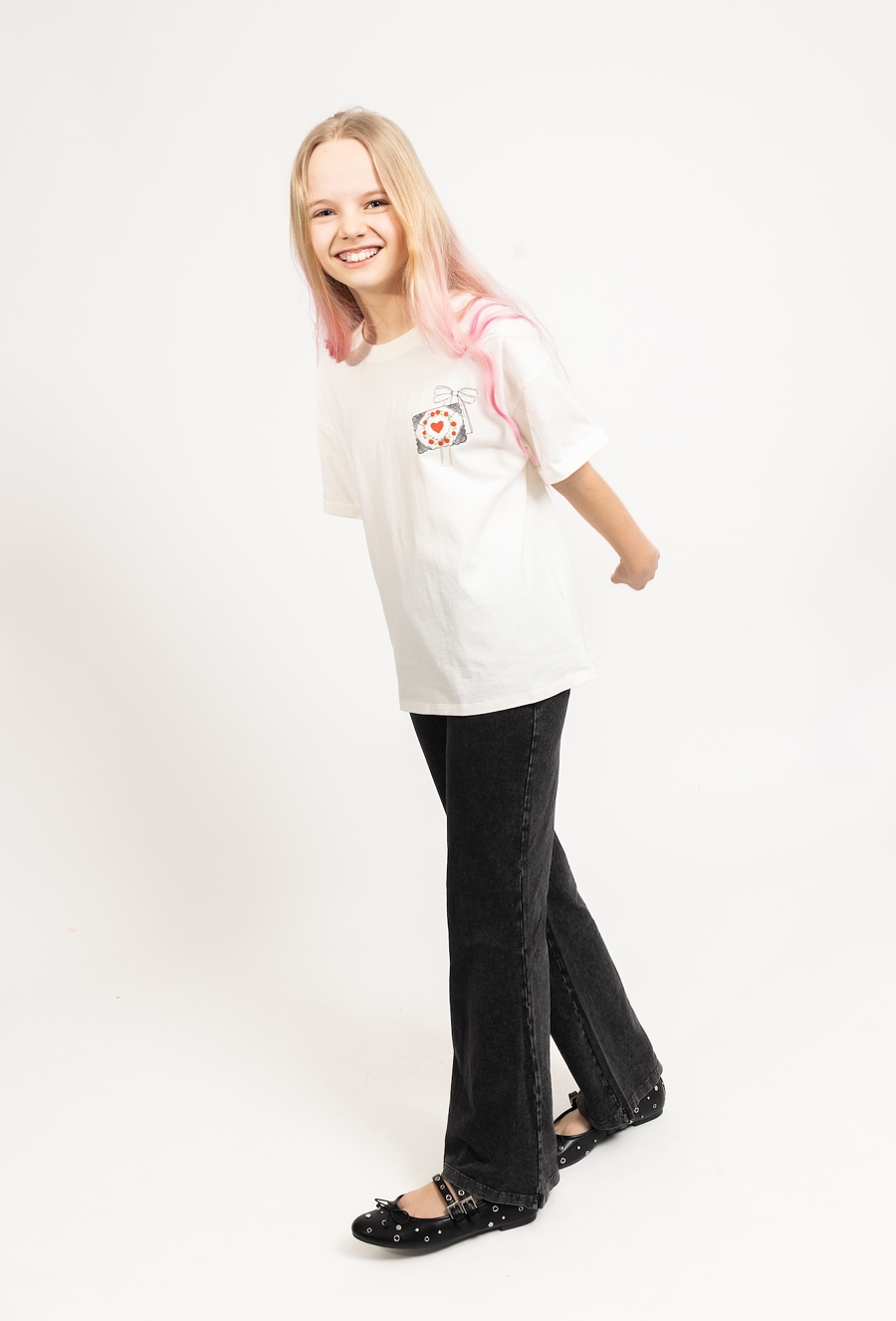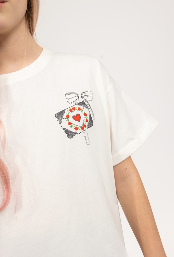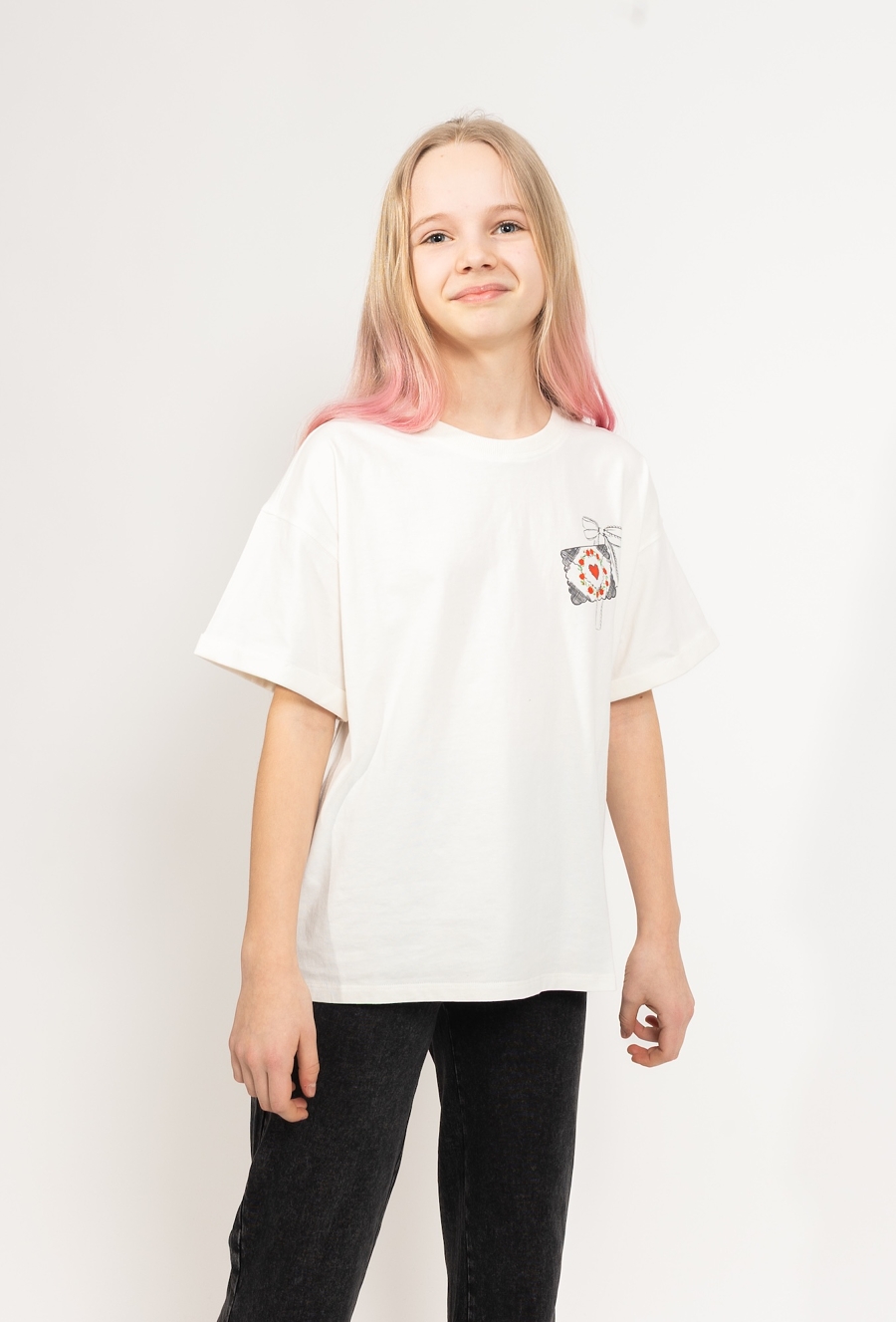 Klasyczna, a jednocześnie urocza – biała koszulka dla dziewczynki uszyta z 100% bawełny to świetna baza do codziennych stylizacji. Jest miękka, przewiewna i przyjemna dla skóry, dlatego sprawdzi się zarówno w cieplejsze dni, jak i pod bluzę czy sweter. Koszulkę wyróżniają podwinięte rękawki oraz delikatny, mały nadruk na piersi: ozdobna grafika z czerwonym sercem i kwiatowym motywem, która dodaje całości subtelnego, dziewczęcego charakteru – bez przesady i bez nadmiaru.