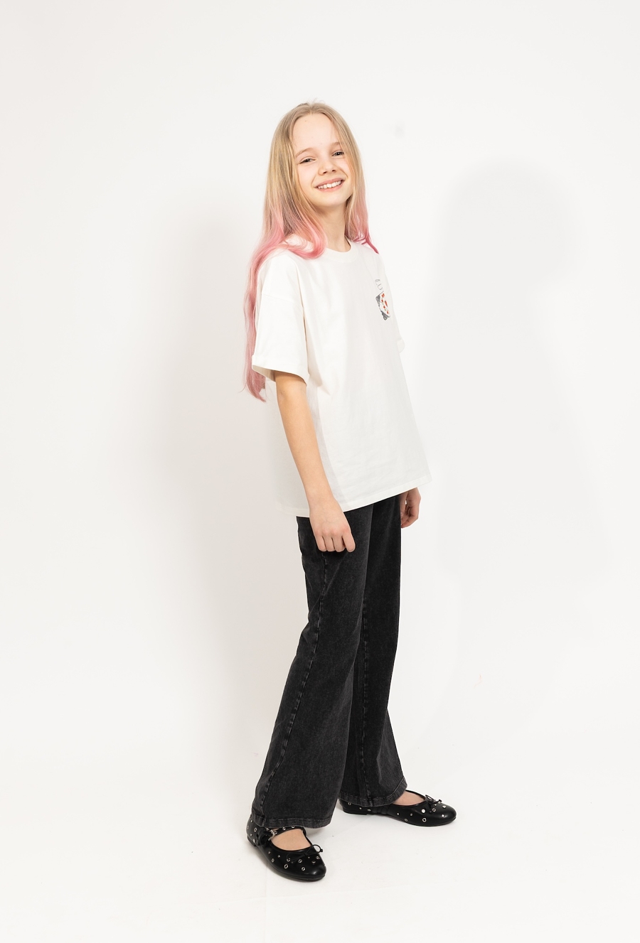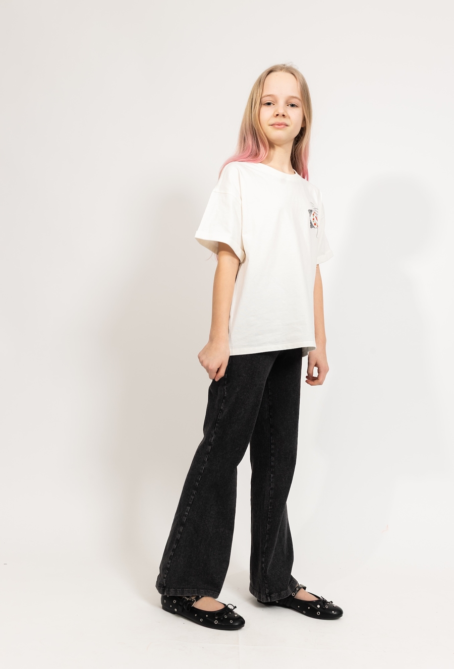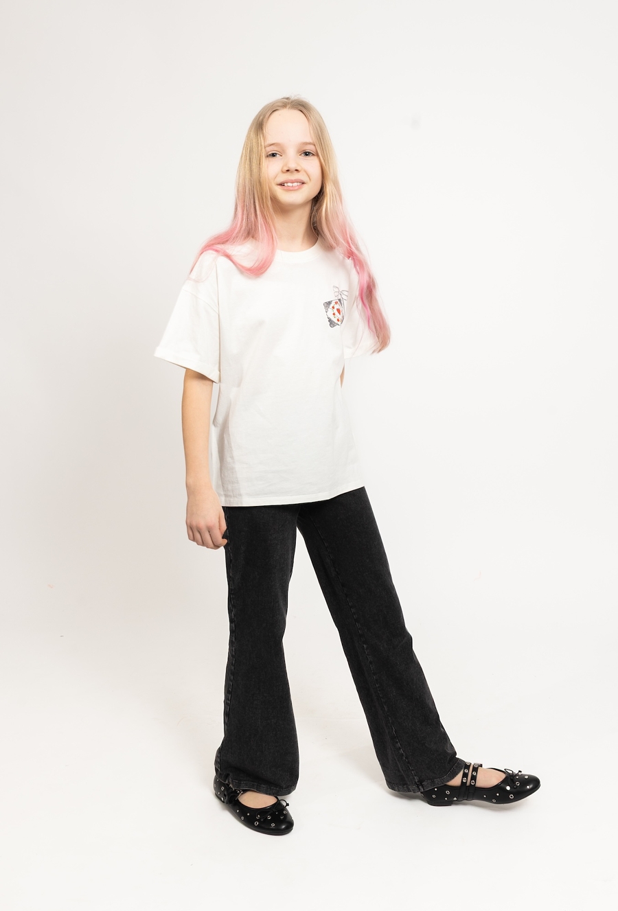 Klasyczna, a jednocześnie urocza – biała koszulka dla dziewczynki uszyta z 100% bawełny to świetna baza do codziennych stylizacji. Jest miękka, przewiewna i przyjemna dla skóry, dlatego sprawdzi się zarówno w cieplejsze dni, jak i pod bluzę czy sweter. Koszulkę wyróżniają podwinięte rękawki oraz delikatny, mały nadruk na piersi: ozdobna grafika z czerwonym sercem i kwiatowym motywem, która dodaje całości subtelnego, dziewczęcego charakteru – bez przesady i bez nadmiaru.