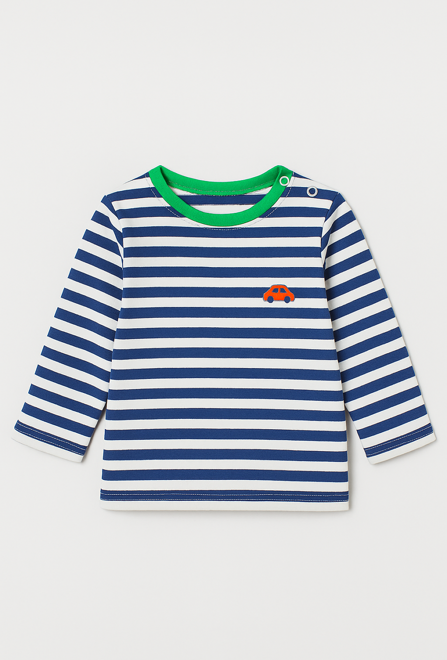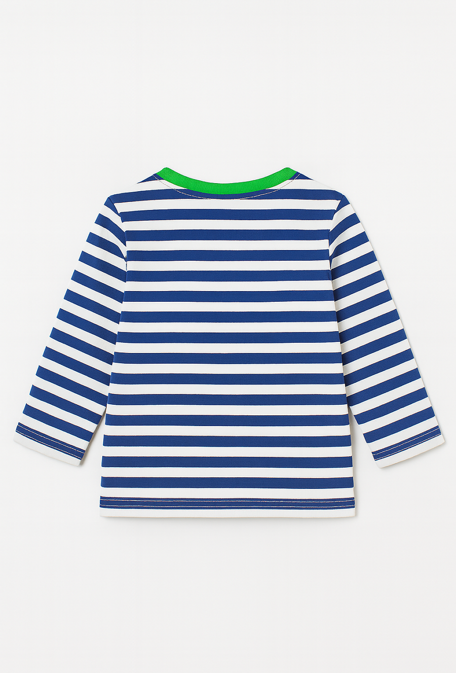 Bluzka niemowlęca w biało-niebieskie paski z kontrastową zieloną lamówką przy dekolcie i uroczym haftem pomarańczowego autka. Uszyta z miękkiej bawełny przyjemnej dla delikatnej skóry dziecka. Zapięcie na ramieniu ułatwia zakładanie. To codzienna baza w wygodnym, chłopięcym wydaniu.