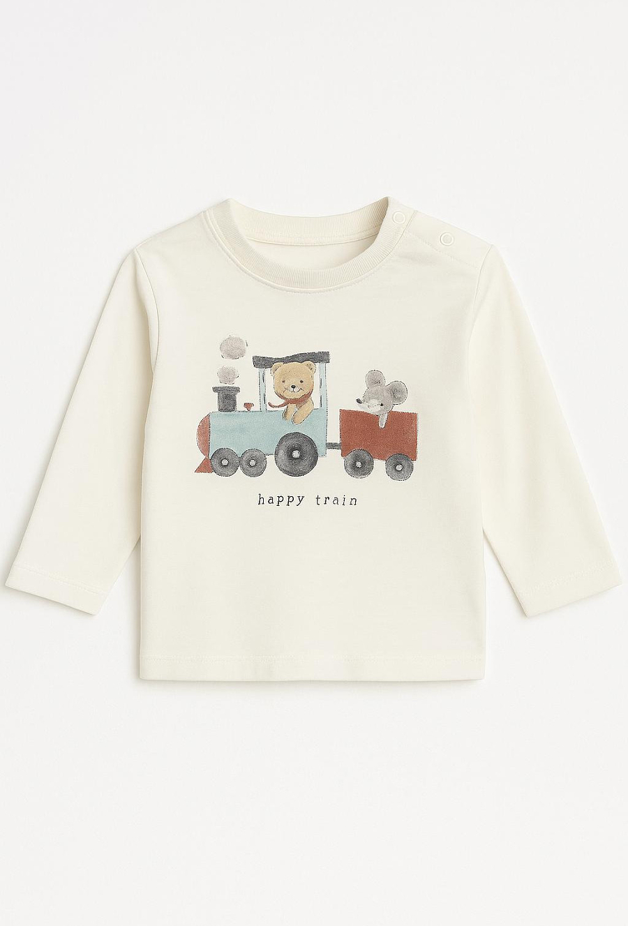 Poznaj idealną propozycję na co dzień – biała bluzka z długim rękawem dla chłopca z uroczym nadrukiem pociągu z napisem "happy train". Wykonana z 100% naturalnej bawełny, zapewnia maksymalny komfort i przewiewność, nawet przy intensywnej zabawie. Miękki materiał jest przyjazny dla skóry dziecka, a praktyczne zapięcie na ramieniu ułatwia ubieranie najmłodszych. Subtelna kolorystyka i delikatny nadruk sprawiają, że bluzka sprawdzi się zarówno w przedszkolu, jak i podczas rodzinnych spacerów.