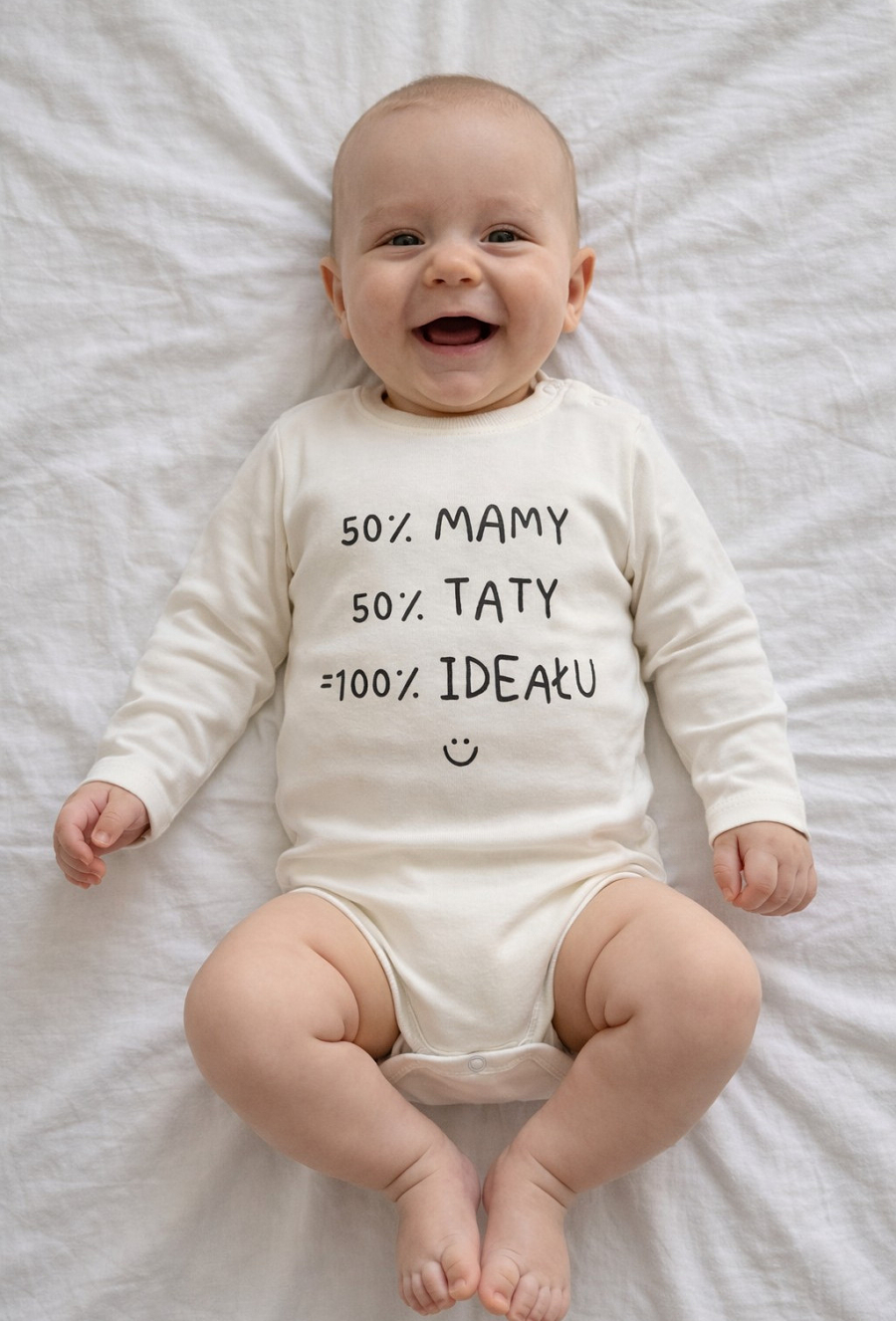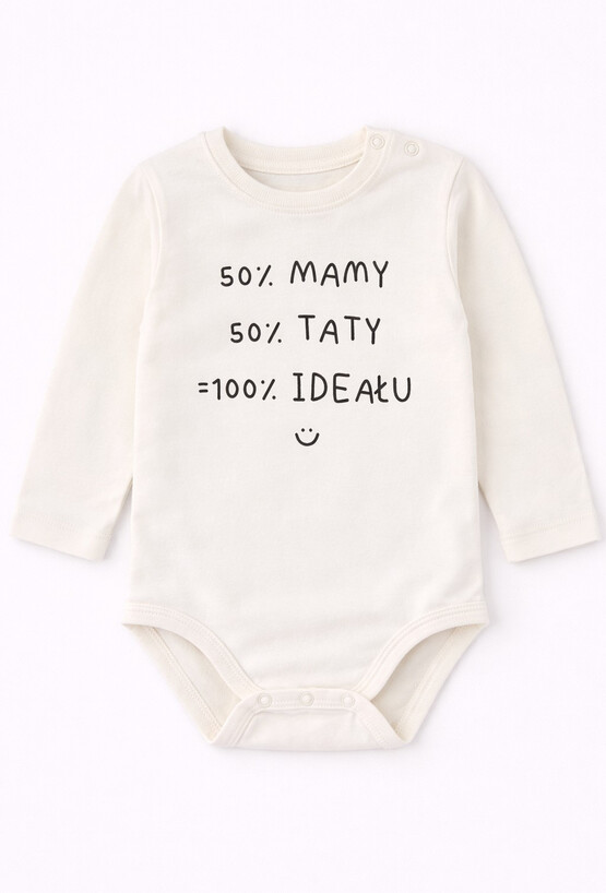 Komfortowe body z długim rękawem ozdobione zabawnym napisem, które doda odrobiny humoru do codziennych stylizacji maluszka. Praktyczne zapięcie ułatwia przebieranie, a miękka tkanina dba o delikatną skórę dziecka.