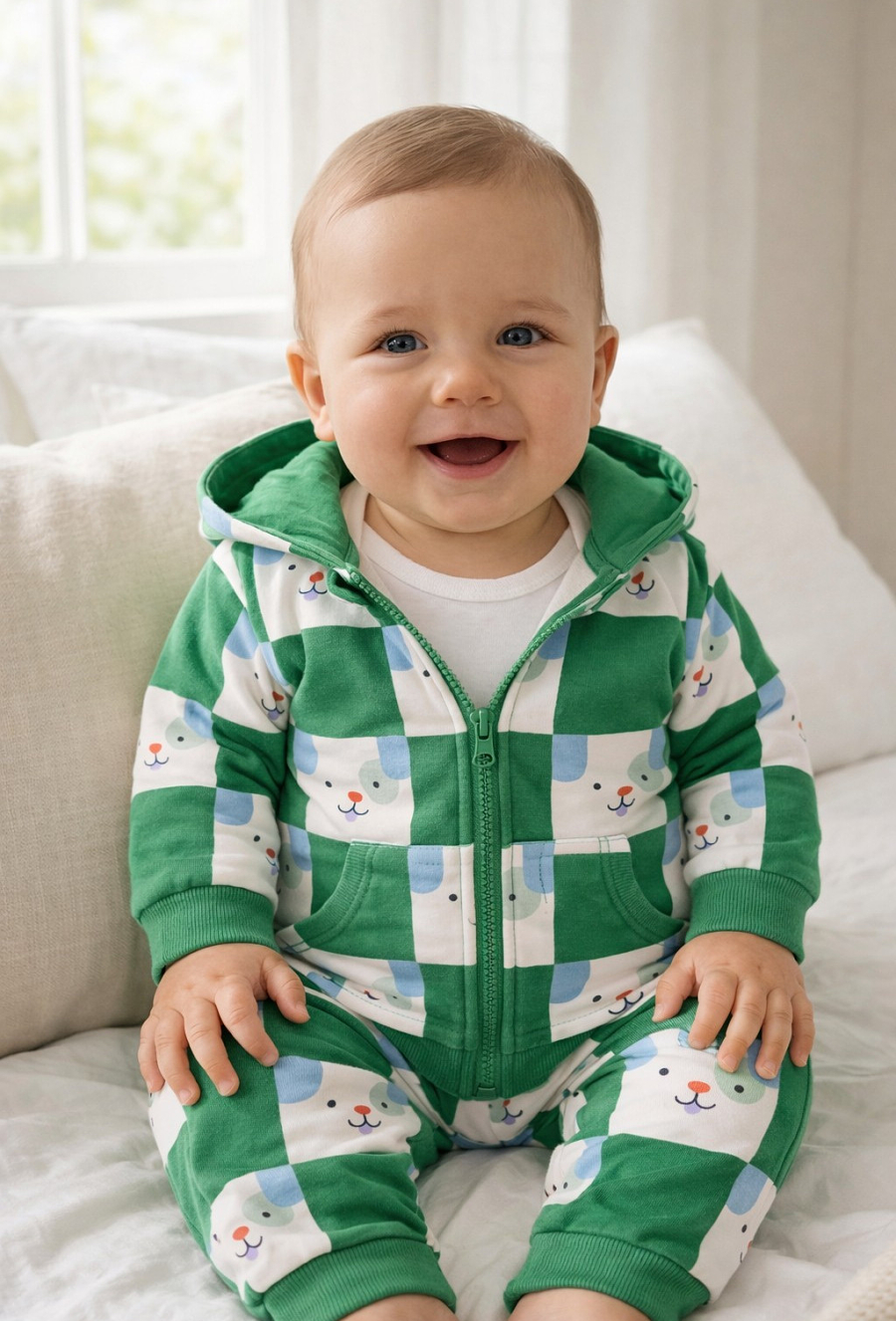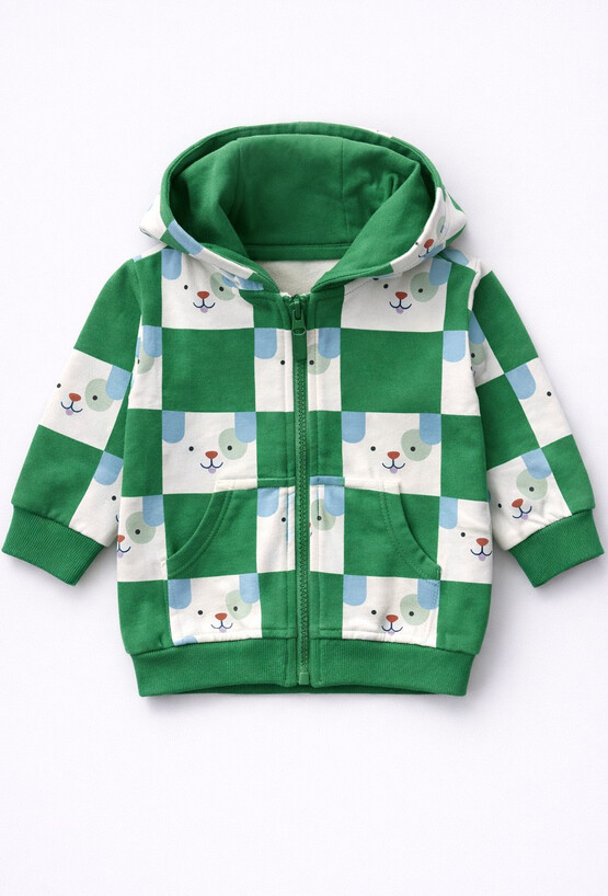Miękka i wygodna bluza rozpinana z kapturem dla niemowlaka chłopca w zielonym kolorze. Wykonana w 100% z bawełny, a od środka wykończona przyjemnym meszkiem, dzięki czemu świetnie sprawdza się w chłodniejsze dni. Uroczy print w pieski dodaje stylu, a praktyczny zamek ułatwia szybkie ubieranie i zdejmowanie.