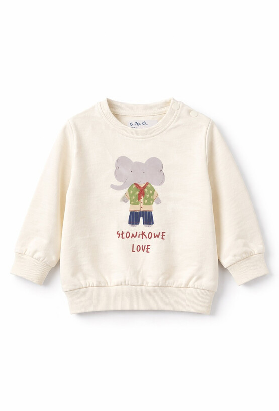 Bluza niemowlęca w kolorze ecru wykonana w 100% z bawełny to wygodna i stylowa propozycja na co dzień. Gładki materiał z podbiciem pętelkowym jest przyjemny w dotyku i dobrze sprawdza się w chłodniejsze dni. Model ozdobiony jest uroczym printem słonia z napisem „Słonikowe love”, który nadaje bluzie dziecięcego, radosnego charakteru. Bluza jest nierozpinana, zakładana przez głowę, a praktyczne napy na ramieniu ułatwiają ubieranie malucha. Zakończenia ściągaczami zapewniają dobre dopasowanie i komfort noszenia.