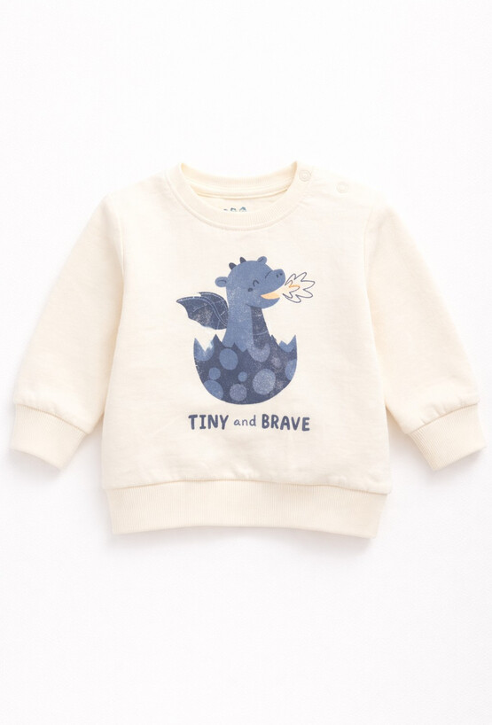 Kremowa bluza niemowlęca z nadrukiem niebieskiego smoka, który z uśmiechem wygląda ze skorupki, i napisem.. To propozycja dla najmłodszych, która łączy komfort noszenia z uroczym designem. Model posiada zapięcie na ramieniu, ułatwiające ubieranie malucha. Ściągacze przy rękawach i w pasie dbają o dobre dopasowanie, a miękka dzianina jest przyjazna dla delikatnej skóry dziecka.