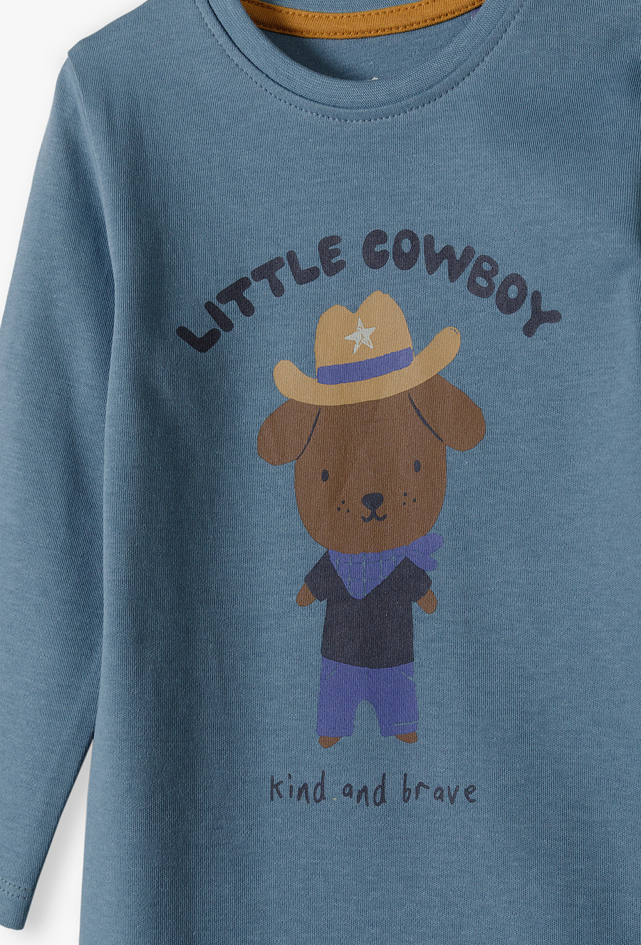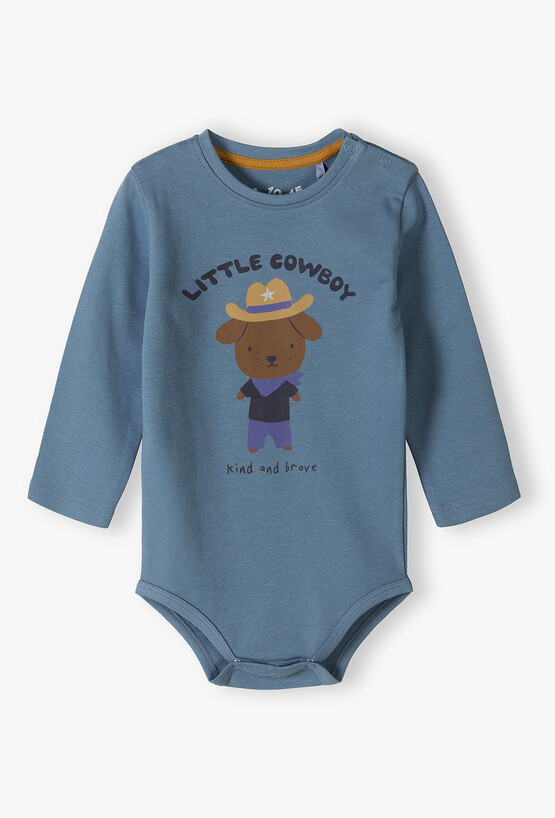Body niemowlęce z długim rękawem, ozdobione nadrukiem pieska - kowboja. Wykonane w 100% z delikatnej, przewiewnej bawełny, dzięki czemu zapewnia komfort noszenia i idealnie sprawdza się na co dzień. Zapięcia na ramieniu oraz w kroku ułatwiają zakładanie i przewijanie. To świetny wybór dla małego chłopca – miękkie, wygodne i z uroczym motywem, który przyciąga uwagę.