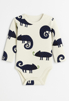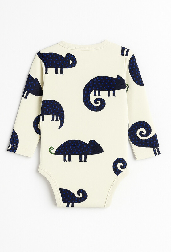 Body niemowlęce z printem kameleonów to idealny wybór dla wszystkich małych odkrywców. Wykonane z miękkiej, oddychającej bawełny, zapewnia dziecku komfort przez cały dzień — zarówno podczas zabawy, jak i drzemki. Długi rękaw chroni przed chłodem, a praktyczne zatrzaski na ramieniu oraz w kroku ułatwiają szybkie przebieranie. Zabawny wzór kameleonów w kontrastowych kolorach dodaje całości energii i świetnie sprawdzi się w codziennych stylizacjach. Funkcjonalne, wygodne i pełne uroku — to body szybko stanie się jednym z ulubionych w niemowlęcej garderobie.