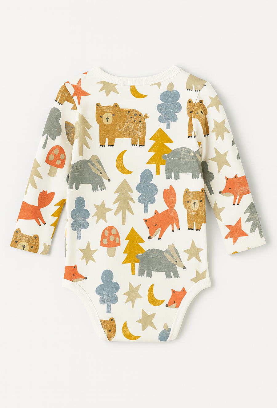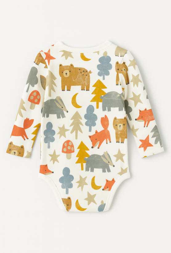 Body chłopięce z leśnym nadrukiem to idealna propozycja dla małego odkrywcy! Urocze grafiki przedstawiające misie, lisy, borsuki i drzewa sprawią, że każdy dzień będzie pełen radości – zarówno dla dziecka, jak i rodzica. Wykonane z miękkiej bawełnianej dzianiny, body zapewnia pełen komfort noszenia, jest delikatne dla skóry i pozwala skórze oddychać. Model z długim rękawem to doskonały wybór na chłodniejsze dni – idealny pod bluzę lub sweterek. Zapięcia na ramieniu i w kroku ułatwiają codzienną pielęgnację i przebieranie malucha.