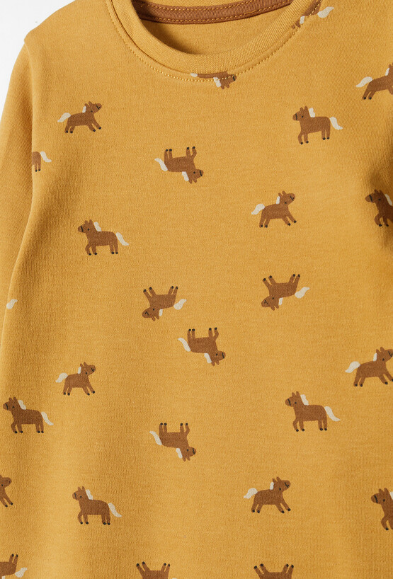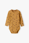 Body niemowlęce z długim rękawem w kolorze brązowym, ozdobione drobnym, motywem koników. Wykonane w 100% z bawełny, zapewnia komfort i przewiewność przez cały dzień. Praktyczne zapięcie na ramieniu oraz w kroku ułatwia ubieranie i przewijanie maluszka. Idealne do codziennych stylizacji – łączy wygodę z uroczym, dziecięcym wzorem.