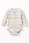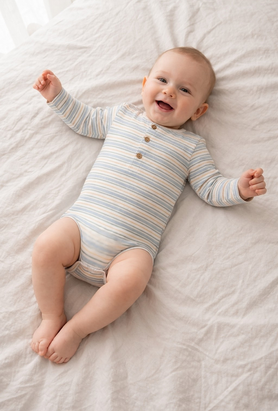 Miękkie body niemowlęce z długim rękawem w delikatne paski to praktyczna propozycja na chłodniejsze dni. Zapięcie na trzy drewnopodobne guziki przy dekolcie nadaje całości charakteru i ułatwia przebieranie. Pastelowe kolory i wygodny krój sprawiają, że body doskonale sprawdzi się zarówno w domu, jak i podczas spacerów.