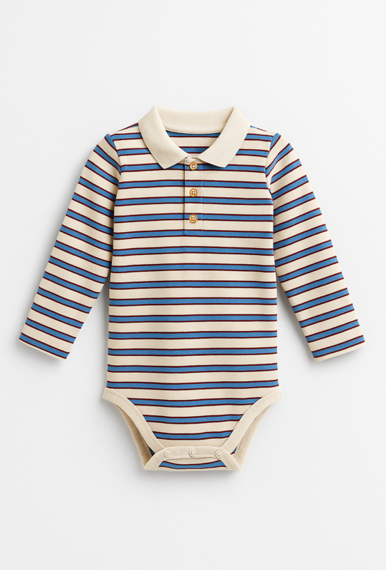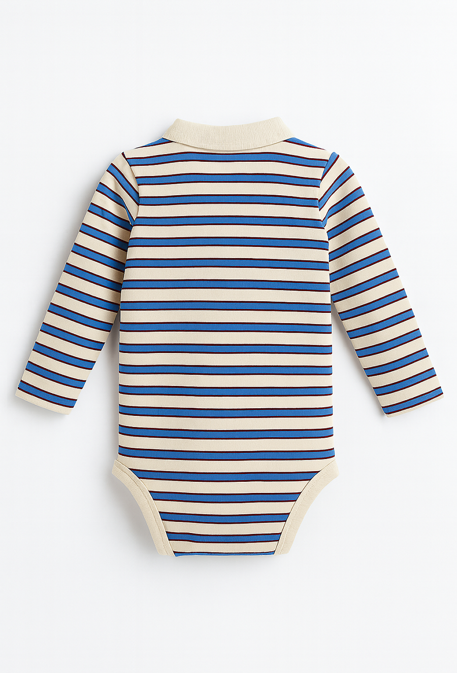 Body niemowlęce w paski z kołnierzykiem to wygodne i stylowe rozwiązanie na co dzień. Drobne guziki pod szyją nawiązują do koszulowego kroju, a klasyczne paski nadają mu lekko retro charakter. Miękki materiał dobrze układa się na ciele i zapewnia komfort noszenia, a zapięcie w kroku ułatwia przebieranie.