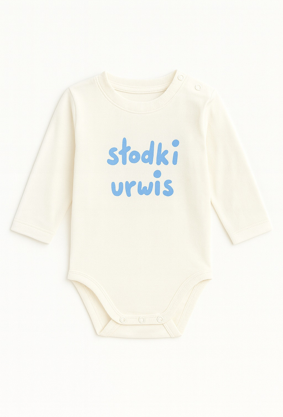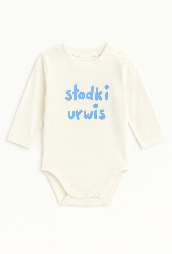 Białe body niemowlęce z długim rękawem wykonane z bawełny z dodatkiem elastanu. Miękki materiał zapewnia swobodę ruchów przez cały dzień. Model ozdobiony jest polskim napisem „słodki urwis” w kolorze niebieskim. Body świetnie sprawdzi się jako baza codziennych stylizacji – zarówno w domu, jak i na spacerze. Długi rękaw zapewnia dodatkowy komfort w chłodniejsze dni, a elastyczna tkanina jest przyjazna dla delikatnej skóry niemowlęcia.