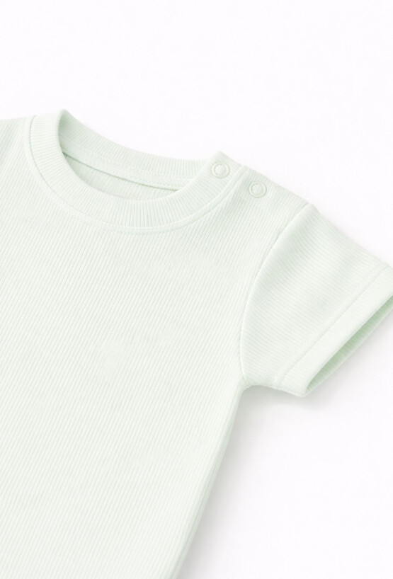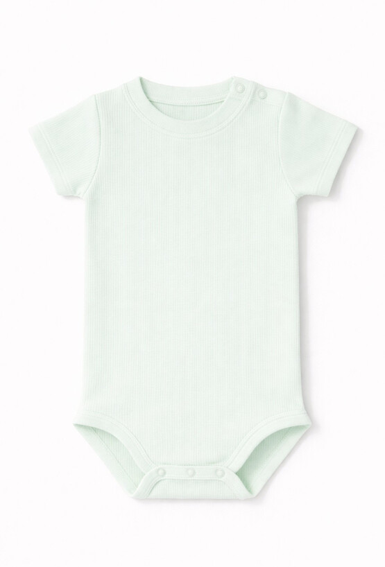 Minimalistyczne zielone body niemowlęce 51015 GROW WITH ME z krótkim rękawem. Wykonane ze strukturalnej dzianiny w prążek (95% bawełna, 5% elastan) świetnie dopasowuje się do ciała i zapewnia swobodę ruchów. Napy na ramieniu ułatwiają zakładanie, a zapięcie w kroku przyspiesza zmianę pieluszki. To idealna baza do codziennych stylizacji – do półśpiochów, spodenek i legginsów.