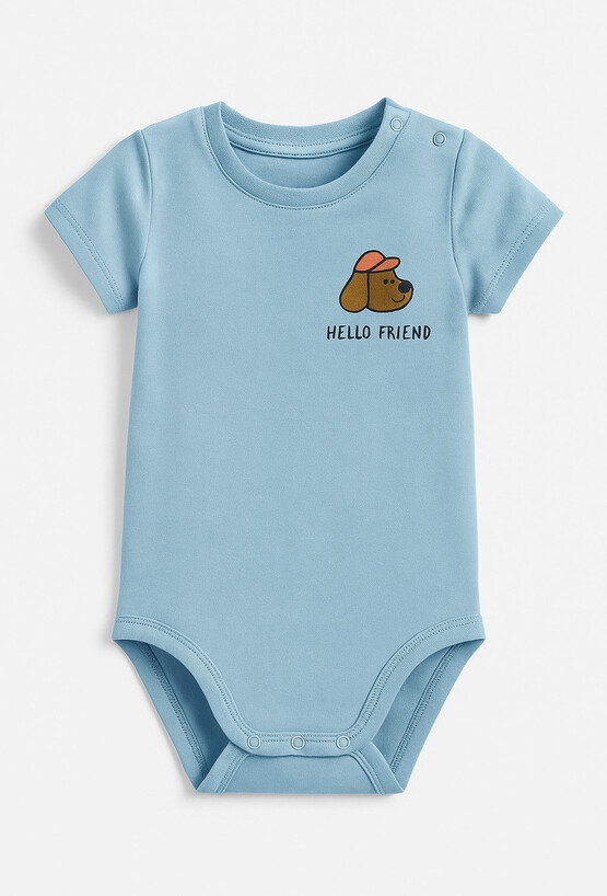 Niebieskie body niemowlęce z krótkim rękawem wykonane w 100% z bawełny to wygodny i praktyczny element codziennej garderoby malucha. Materiał zapewnia swobodę ruchów oraz komfort noszenia przez cały dzień. Model z boku jest ozdobiony delikatnym nadrukiem pieska w czapeczce, który dodaje całości uroczego, dziecięcego charakteru.