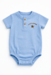 Niebieskie body niemowlęce z krótkim rękawem wykonane z bawełny z dodatkiem elastanu to wygodna propozycja do codziennego noszenia. Strukturalny materiał o prążkowanej fakturze jest elastyczny i miękki. Model posiada luźniejszy krój, który zapewnia swobodę ruchów i komfort przez cały dzień. Body zapinane jest na guziczki z przodu, co ułatwia ubieranie i zdejmowanie. Po prawej stronie znajduje się subtelny haft z napisem „Little Elephant”.