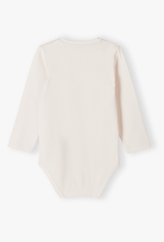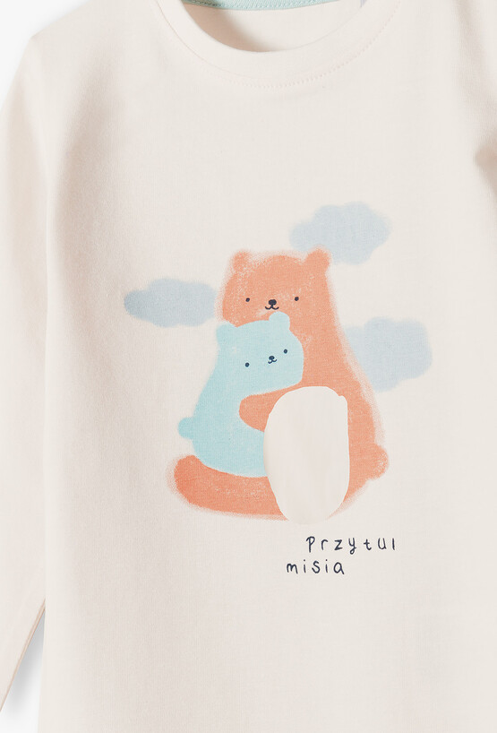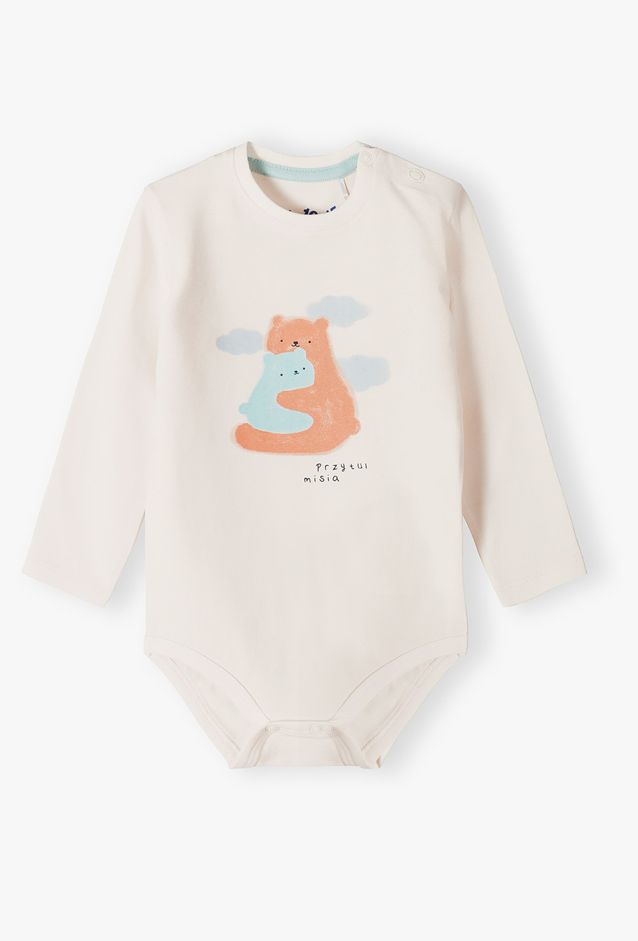 Urocze body niemowlęce z długim rękawem, ozdobione pastelowym nadrukiem misiów i napisem „Przytul misia”. Wykonane z miękkiej, oddychającej dzianiny bawełnianej, zapewniającej najwyższy komfort i bezpieczeństwo dla wrażliwej skóry dziecka. Praktyczne zapięcia na ramieniu i w kroku ułatwiają przebieranie. Idealne do codziennych stylizacji i jako warstwa pod sweterek lub pajacyk.