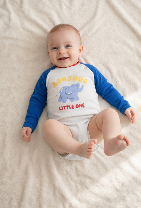 Body, które wita dzień z radosnym "Bonjour"! Miękki kolorowy nadruk z uroczym słonikiem i przyjaznym napisem nadaje całości wyjątkowego uroku. Niebieskie rękawy dodają charakteru, a praktyczne zapięcie na ramieniu i w kroku zapewnia wygodę podczas ubierania i przewijania. Miękki materiał delikatnie otula skórę dziecka, gwarantując komfort przez cały dzień. Idealne na co dzień, do zabawy i na rodzinne spotkania – wszędzie tam, gdzie liczy się wygoda i odrobina dziecięcej radości!