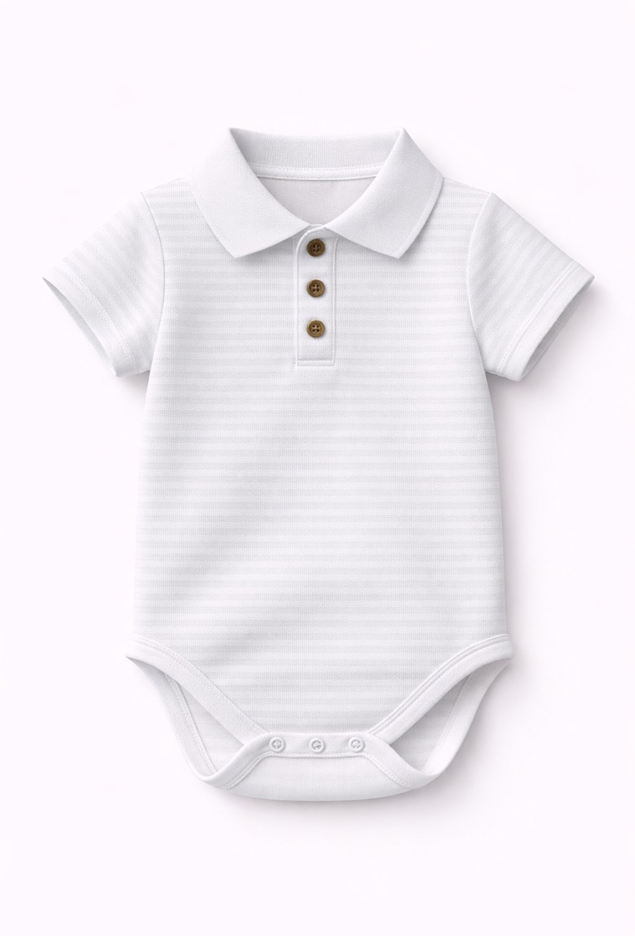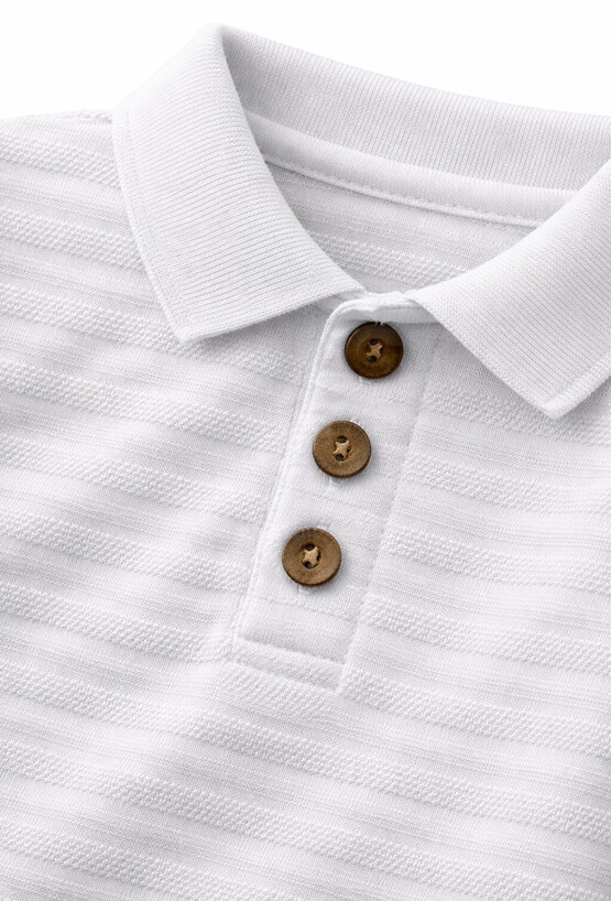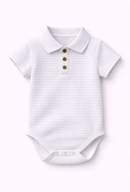 Białe body niemowlęce z krótkim rękawem i kołnierzykiem w stylu polo to lekka i komfortowa propozycja na lato. Wykonane z prążkowanej dzianiny o subtelnej strukturze pasków. Klasyczny fason i miękki materiał zapewniają swobodę noszenia przez cały dzień. Idealne pod spodenki, spodnie czy do samodzielnego noszenia w upalne dni.