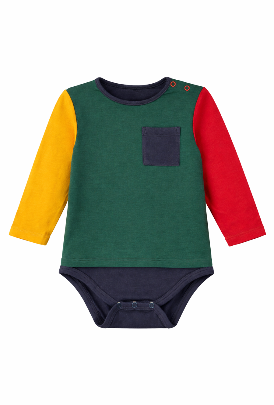 Body z długim rękawem zachwyca oryginalnym designem, łączącym aż cztery kolory w jednej stylizacji. Miękki i delikatny materiał zapewnia komfort noszenia, a praktyczne zapięcie ułatwia przebieranie maluszka. Idealne na co dzień, dodaje uroku i radości każdej dziecięcej garderobie.