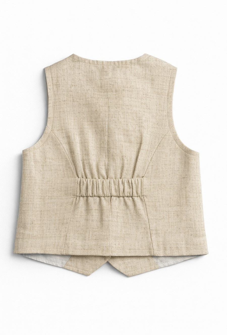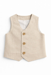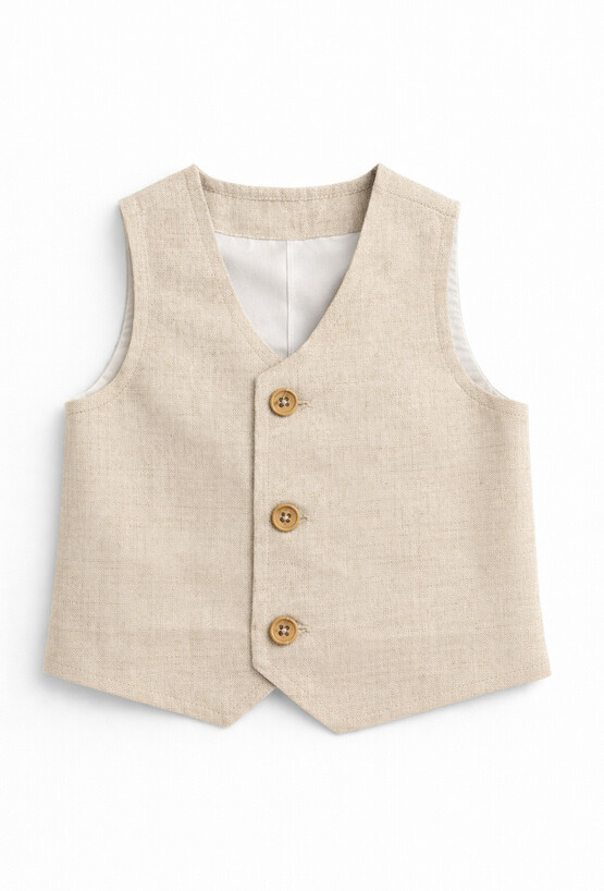 Beżowa kamizelka chłopięca wykonana z tkaniny z domieszką lnu to stylowy element garderoby na wyjątkowe okazje. Połączenie wiskozy i lnu sprawia, że materiał jest lekki, przewiewny i przyjemny w noszeniu, a jednocześnie prezentuje się bardzo elegancko. Klasyczny fason z zapięciem na guziki nadaje kamizelce ponadczasowego charakteru. Model doskonale sprawdzi się podczas uroczystości rodzinnych, świąt czy innych ważnych wydarzeń. Kamizelka stanowi idealne uzupełnienie stylizacji.