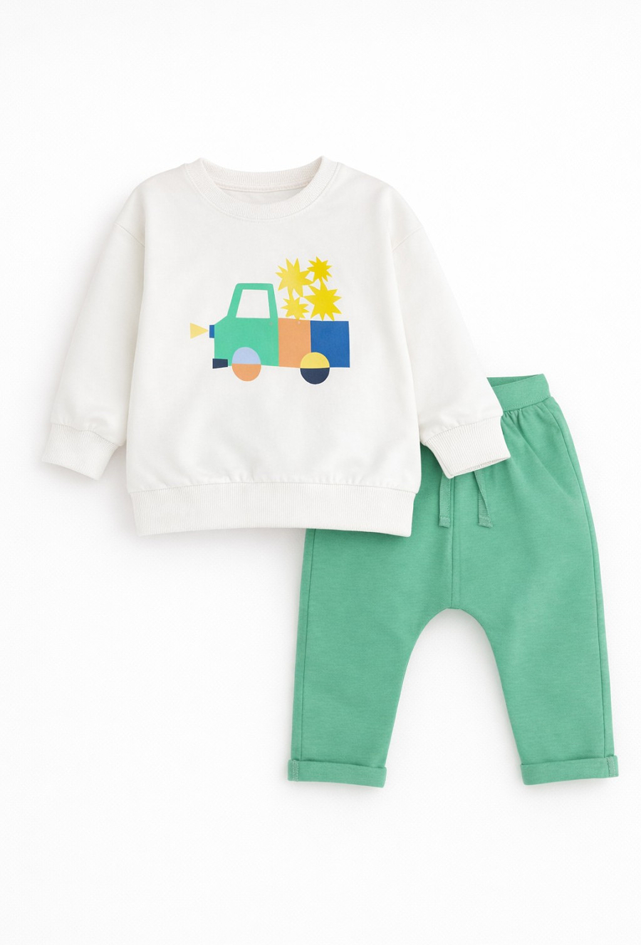 Komfortowy komplet dresowy dla chłopca, wykonany w 100% z naturalnej, oddychającej bawełny. W zestawie znajdziesz: Zielone spodnie dresowe z elastyczną talią i dekoracyjnym sznurkiem. Luźny krój zapewnia dziecku pełną swobodę ruchów, a nogawki można wygodnie podwinąć. Bluza z haftem, która dodaje zestawowi uroku. Komplet sprawdzi się zarówno w przedszkolu, jak i podczas codziennych zabaw. To idealny wybór dla aktywnego malucha.
