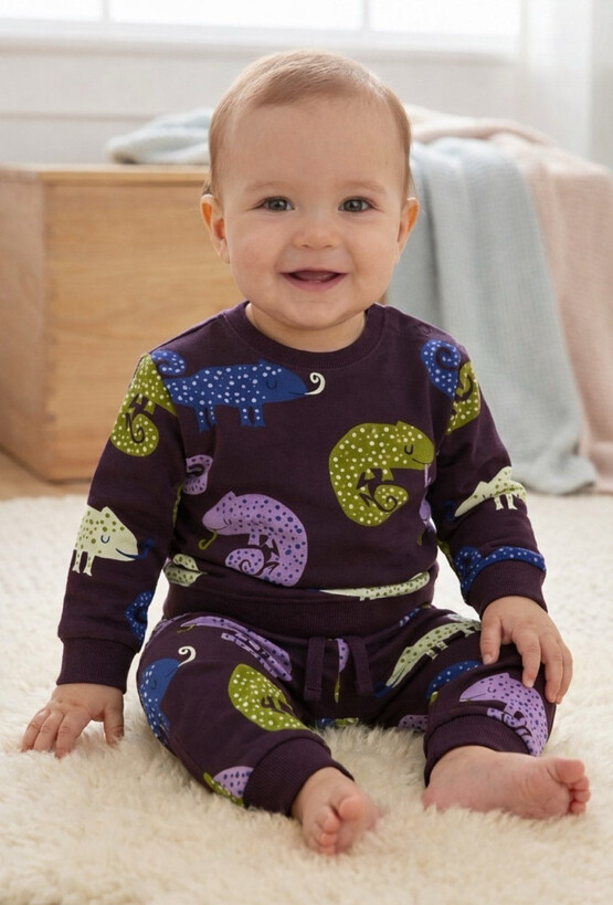 Wygodny komplet dresowy dla dziecka, który zapewni komfort podczas codziennych aktywności. Bluza i spodnie zostały wykonane z miękkiej tkaniny, przyjemnej dla delikatnej skóry malucha. Luźny krój nie ogranicza ruchów, a elastyczne ściągacze utrzymują ubranie na swoim miejscu. Wyrazisty wzór z kameleonami dodaje całości uroku. Idealny wybór na spacer, zabawę w domu czy wyjście do przedszkola.