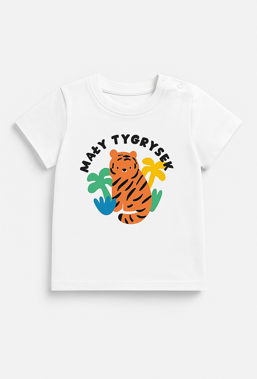 Biała koszulka niemowlęca z krótkim rękawem i kolorowym nadrukiem przedstawiającym tygrysa oraz napis. Wykonana z miękkiej, przyjemnej w dotyku tkaniny, która zapewnia maluchowi komfort przez cały dzień. Idealna do codziennego noszenia – solo lub w zestawie z szortami.