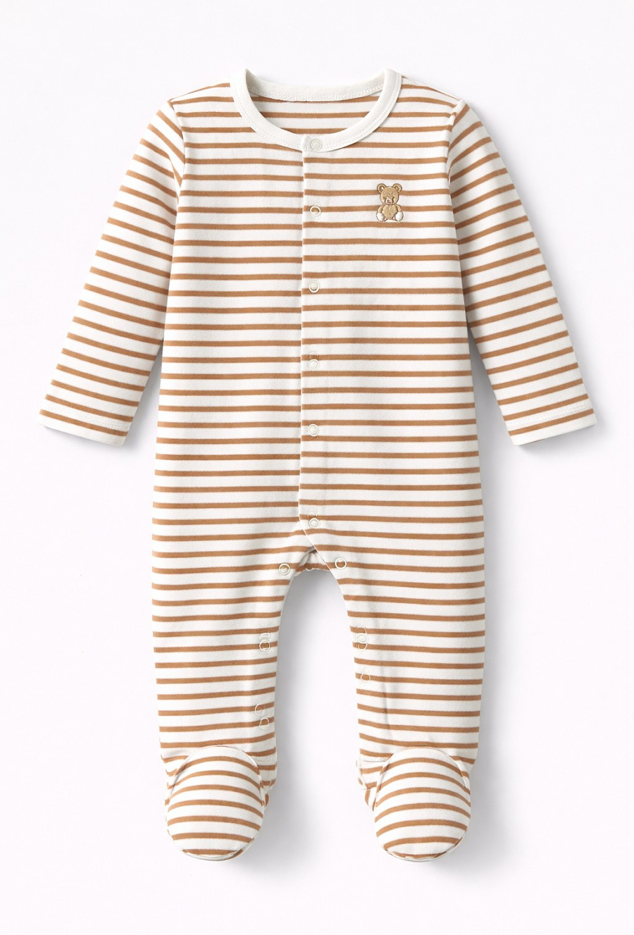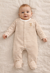 Wygodny pajac niemowlęcy dla chłopca wykonany w 100% z bawełny, która jest miękka, oddychająca i delikatna dla wrażliwej skóry dziecka. Klasyczny wzór w paski w ciepłych, naturalnych odcieniach nadaje całości ponadczasowego charakteru. Model zapinany na praktyczne napy na całej długości ułatwia szybkie przebieranie oraz zmianę pieluszki. Długie rękawy zapewniają komfort cieplny, a funkcjonalne rozwiązania sprawiają, że pajac doskonale sprawdzi się zarówno w ciągu dnia, jak i podczas snu. Uwaga: rozmiary do 74 posiadają zabudowane stópki, które zapewniają dodatkowe ciepło i wygodę najmłodszym dzieciom.
