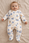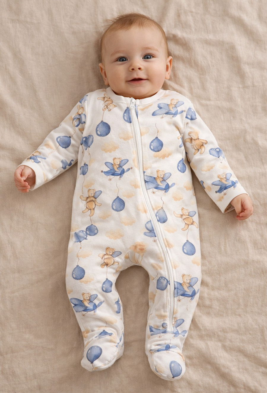 Bawełniany pajac niemowlęcy dla chłopca wykonany w 100% z bawełny, która jest miękka, oddychająca i bezpieczna dla wrażliwej skóry dziecka. Jasna kolorystyka oraz delikatny nadruk nadają całości przytulny, dziecięcy charakter. Model zapinany na praktyczny zamek błyskawiczny na całej długości, który ułatwia szybkie przebieranie i zmianę pieluszki. Rozmiary do 74 posiadają zabudowane stópki, zapewniające dodatkowe ciepło i komfort. Pajac idealnie sprawdzi się zarówno jako strój dzienny, jak i piżamka.