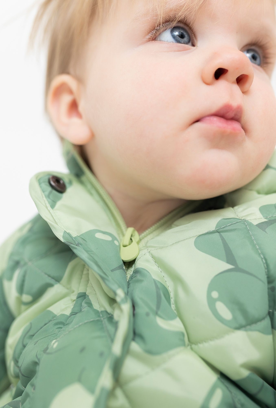 Zielona pikowana kurtka niemowlęca z uroczym wzorem słoników to idealny wybór na chłodniejsze dni. Lekka, ale ciepła tkanina zapewnia komfort termiczny, a praktyczny kaptur chroni przed wiatrem. Kurtka posiada wygodne zapięcie na suwak, które ułatwia szybkie ubieranie maluszka. Elastyczne mankiety zapobiegają przedostawaniu się zimna, a miękki materiał sprawia, że dziecko czuje się swobodnie podczas każdej aktywności.