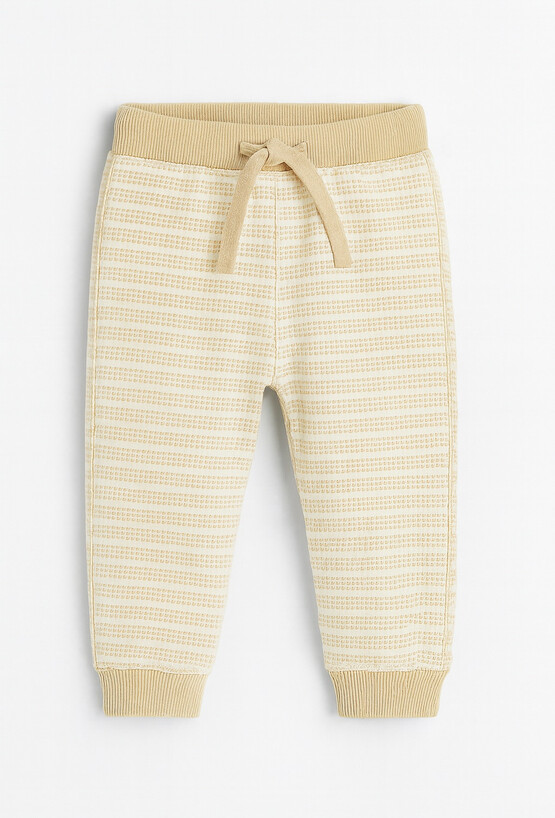 Spodnie dresowe dla chłopca, idealne do wszelkich codziennych aktywności. Wykonane w 100% z miękkiej i przewiewnej bawełny, zapewniają pełen komfort noszenia. Elastyczny pas z wiązaniem gwarantuje idealne dopasowanie, a delikatny wzór dodaje uroku i subtelności. Prążkowane ściągacze przy nogawkach chronią przed podwijaniem się materiału, dzięki czemu spodnie świetnie sprawdzają się zarówno w domu, jak i podczas spacerów. To praktyczny, wygodny i stylowy element dziecięcej garderoby – idealny do codziennych stylizacji.